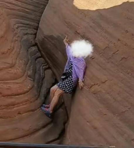 大妈正在红色岩石上调整拍照姿势。图据网友视频截图