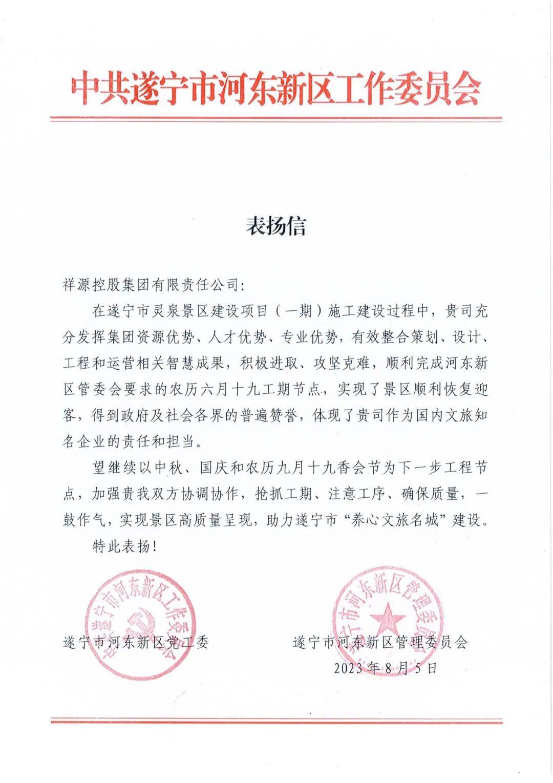 灵泉景区从2023年2月由祥源控股集团旗下建设板块专业公司祥源建设承建,有效整合投资、策划、设计、建设和运营专业条线,并与当地政府、项目业主等多单位密切合作形成合力,历时近半年封闭施工,顺利完成景区西入口片区改造提升,实现景区农历六月十九香会节恢复迎客,其“祥源速度”“祥源质量”“祥源创意”,均得到当地政府及社会各界普遍赞誉。遂宁市河东新区党工委书记夏海荣说:“灵泉景区西入口片区建设,体现了祥源控股集团作为国内知名文化旅游领军企业的专业能力和责任担当!”