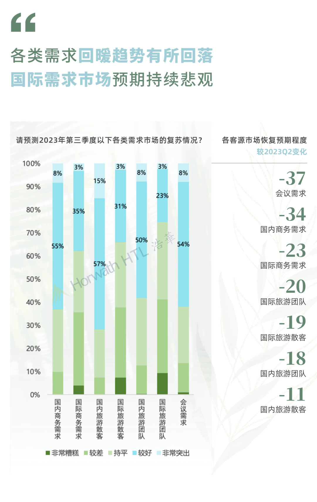 随着国内疫情管控政策的全面放开,消费端的强劲需求释放出积极信号,文旅市场回弹迅速。整体来看,对于第三季度的实际业绩表现,市场对于住宿率、平均房价和总收入的预期趋势较为一致,均呈现积极的预期结果。