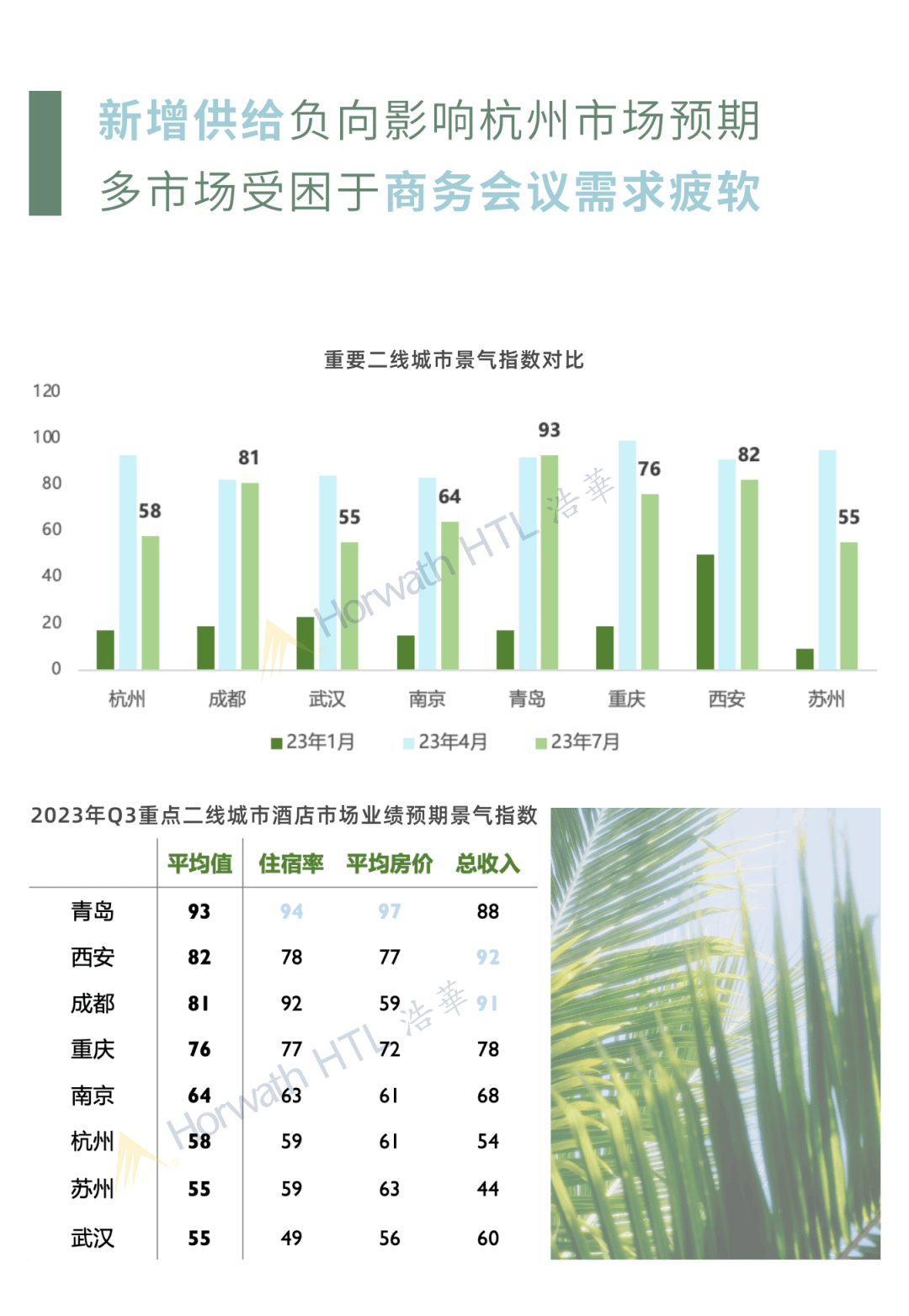 同为长三角经济圈的重要二线城市,南京及苏州两城均未延续上一季度的增长态势,本季度综合景气指数下滑明显,下降指数点均超过20,受访者对第三季度的收入预期保持谨慎的态度。从各类市场需求来看,受访酒店对商务与会议市场需求展现出相对消极的预期。