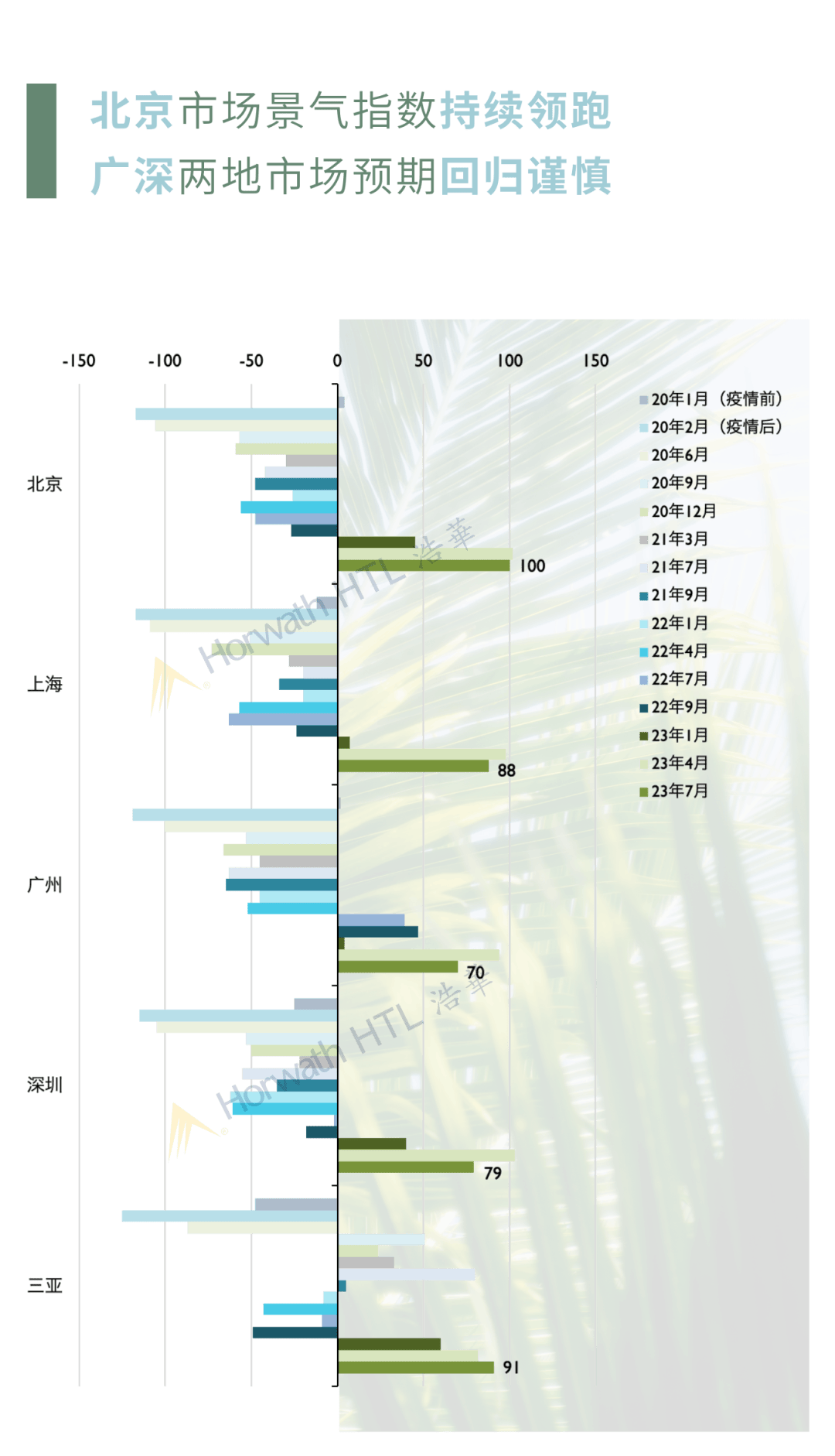 本次调查中,酒店市场业绩前景预测部分所呈现的景气指数反映了市场对整体业绩表现的期望值。该指数范围从-150至+150,“-150”表示市场对预期业绩表现非常悲观,“0”表示业绩预期持中立态度,“+150”则表示市场的预期值十分乐观。