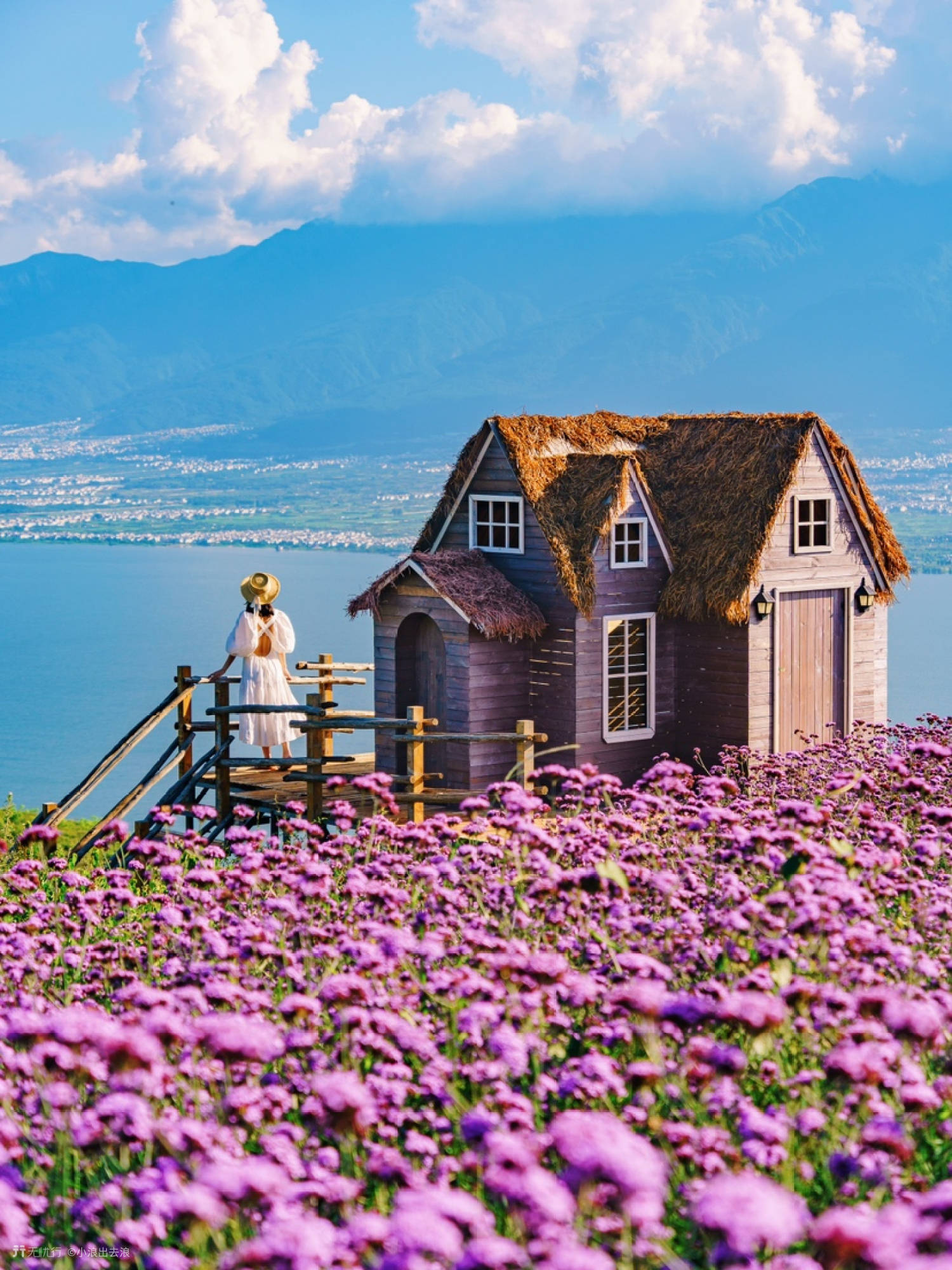 在文笔村制高点建的拍摄基地,大片的马鞭草花海和小木屋,南法既视感。