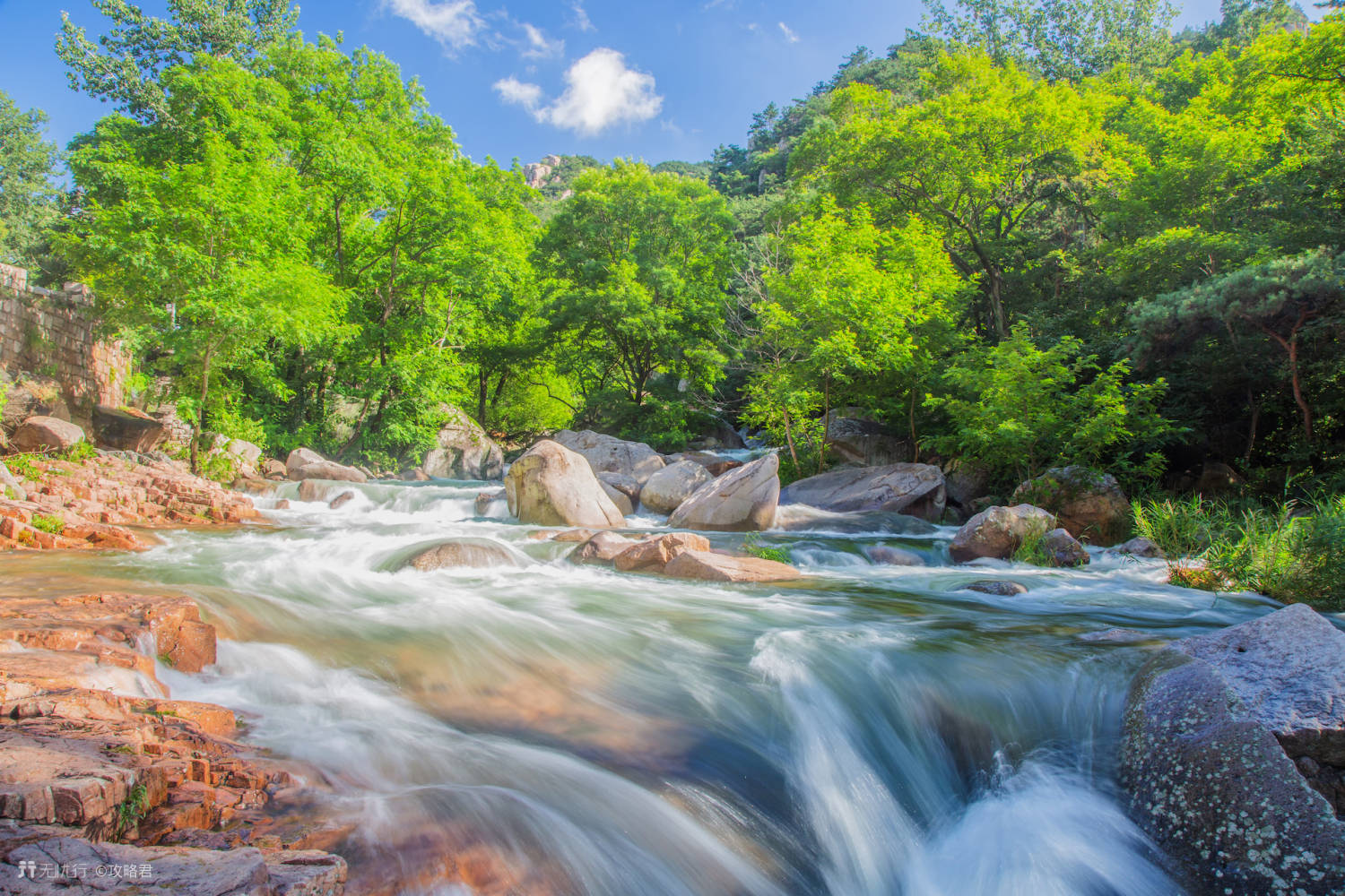 北九水位于崂山之中,外有层层山峦和茂密森林围绕,茂盛的森林避免了夏日阳光的毒晒,将炎热的暑气完全隔绝在山谷之外;内有潺潺溪流给人们送来阵阵清凉,让人享受夏天难得的舒适。
