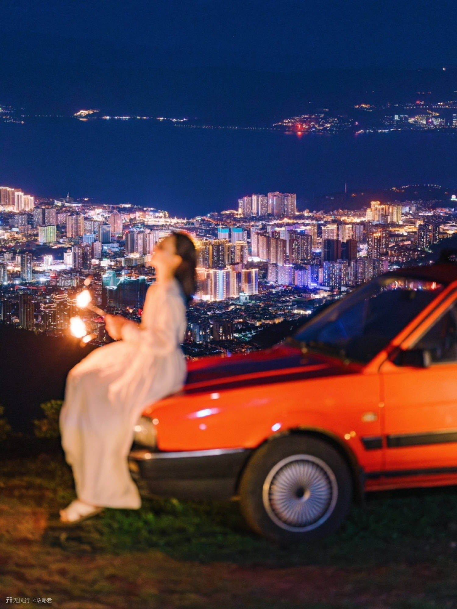 大理版lalaland,从山顶看整个城市灯火亮起,巨浪漫!有好几个机位,其中有红色汽车的地方(2号营地)最出片。
