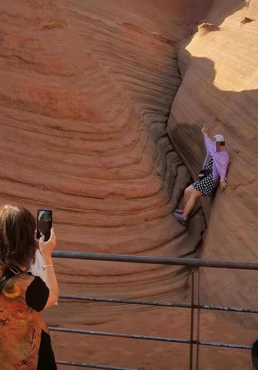 视频显示,一名游客站在景区护栏内的丹霞地貌岩层处,双手扶着岩层,不停变换姿势,同行的另一名游客在护栏外为她拍照。