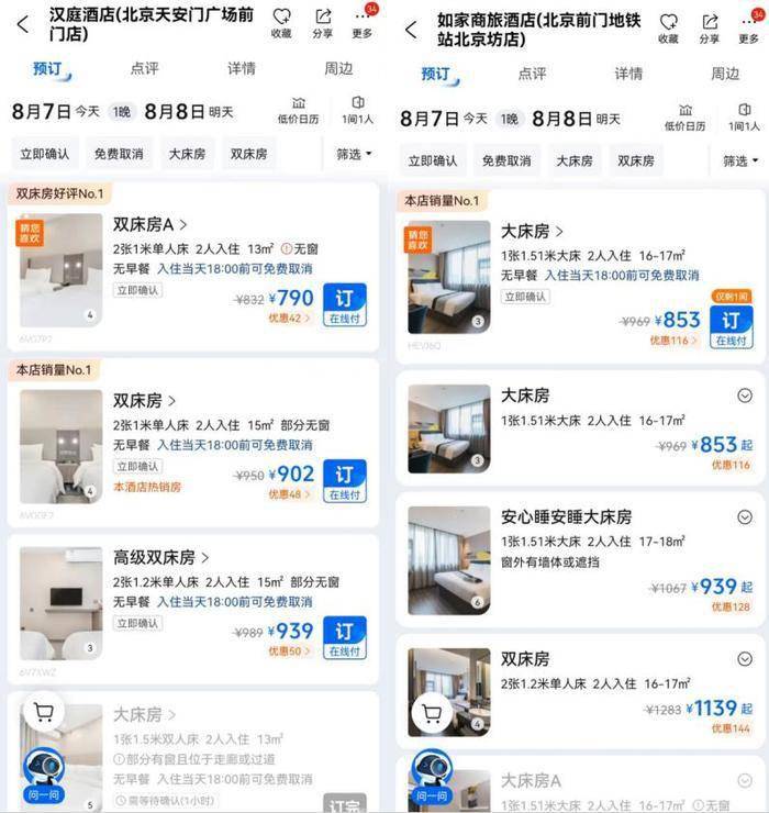 据报道,位于北京核心商业地段的汉庭等经济型酒店价格接近千元。中新经纬从携程查看到,7日北京天安门附近的汉庭、如家商旅酒店价格接近千元,部分房型高达1138元。同日,河南郑州CBD附近如家商旅酒店价格在378元-499元之间,河北石家庄裕华万达广场店价格在293元-352元之间。