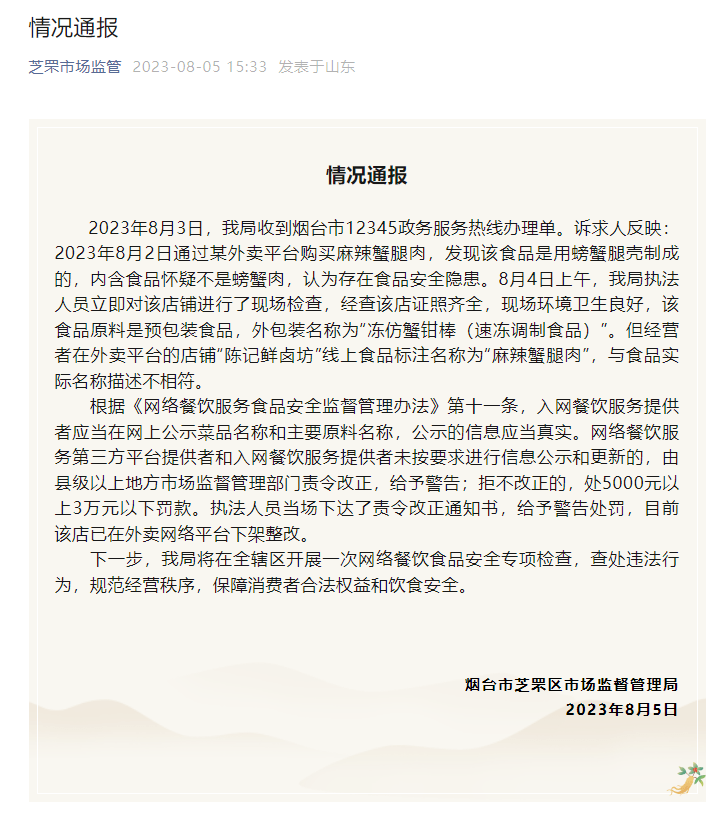 针对上述情况,8月5日,烟台市芝罘区市场监督管理局发布通报称,已下达责令改正通知书,并给予警告处罚,目前该店已在外卖网络平台下架整改。