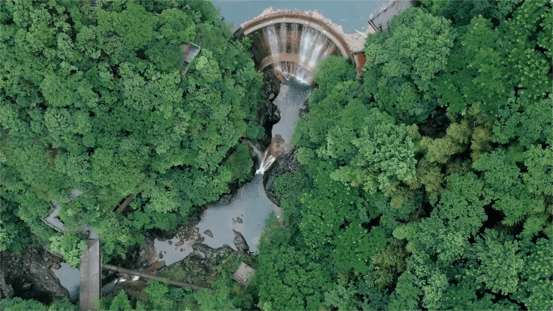 清澈的飞瀑潭水从20多米高度的地方直泻而下,从翠林修竹的山间奔涌而出,清冽的水,翠绿的竹,激荡的水汽,此时再来一壶酒,一把古琴,定有高山流水遇知音文人之风。