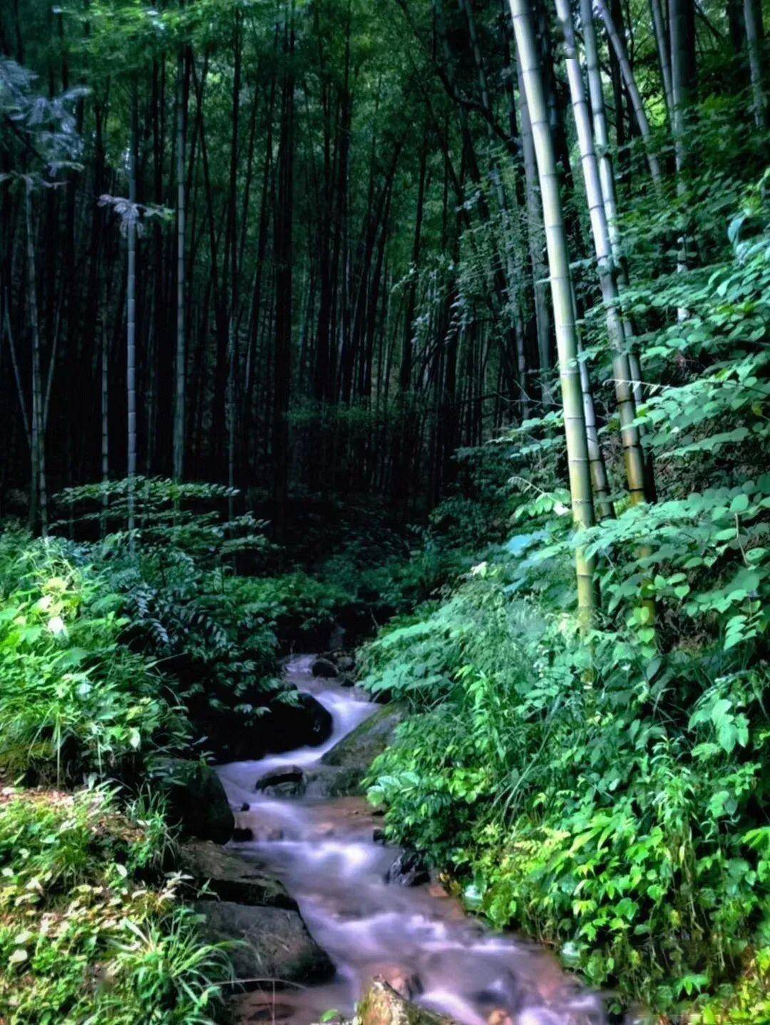 溪水中的鱼儿,在云彩的倒影中游来游去,就像长着鳞片的鸟儿在另一片空间飞过。微风吹起,竹叶上的雨水沙沙而落。落在石板路、土地上、小溪中,声音各不相同。闭眼睛听,就是一首绝妙的曲子。