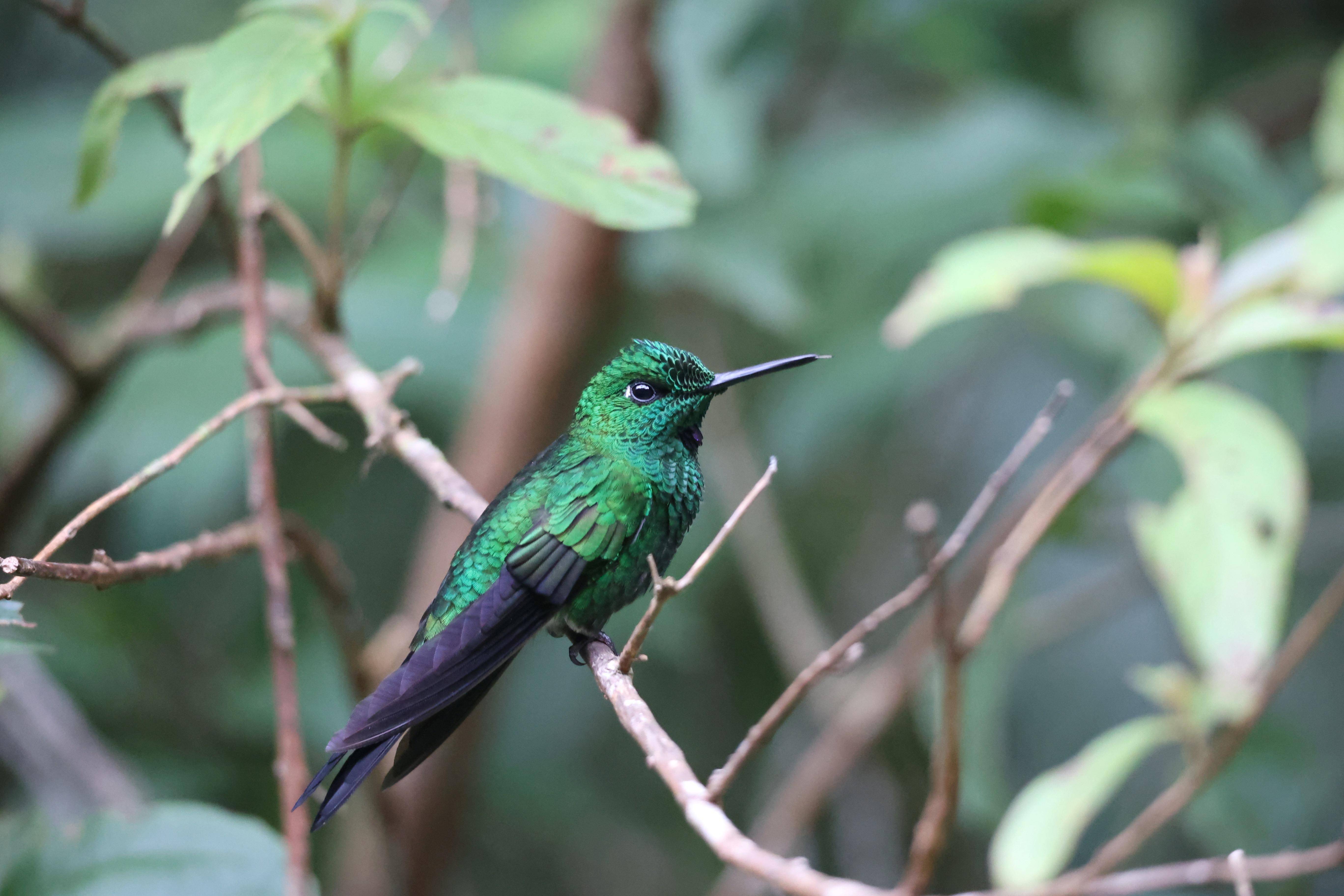 7月24日,哥斯达黎加蒙特韦德云雾森林生物保护区的一只紫刀翅蜂鸟停在林中。 新华社记者 范小林 摄