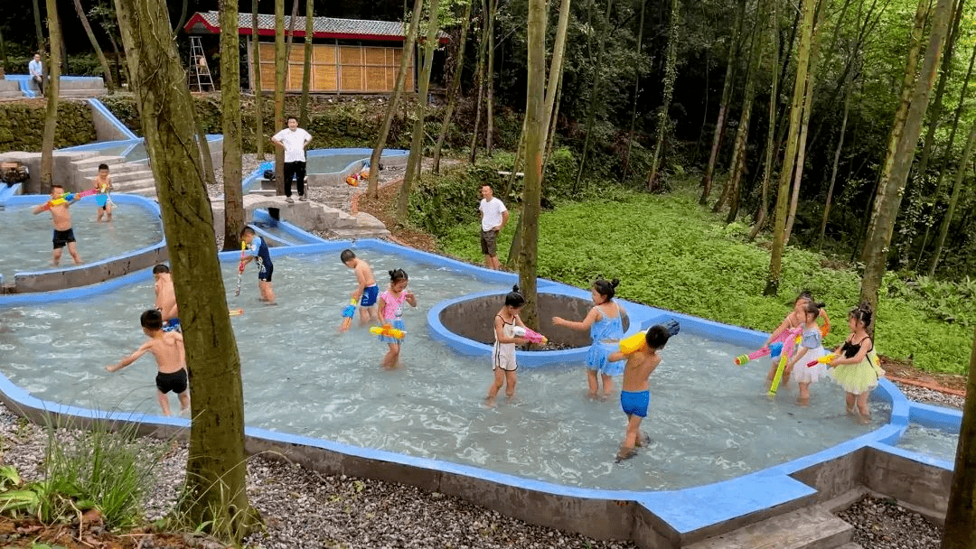 赏景结束,就可以到寨子里的 高山森林亲子戏水池耍耍水啦!水源来自美女峰岩缝里的山泉水,水质清澈见底,冰凉清爽。在这里,你可以和孩子们一起带上玩水装备捞网、水枪、水桶……打卡玩水的100种可能,玩出童年夏天该有的纯真模样。