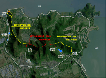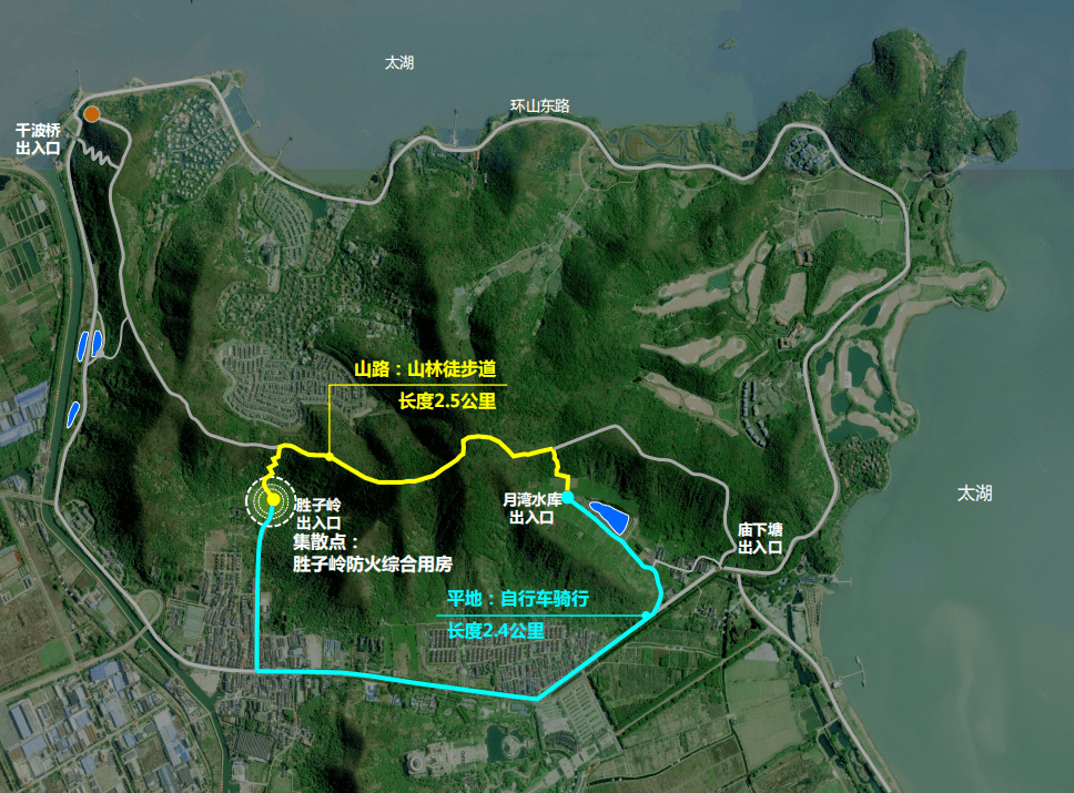 观景线路:胜子岭出入口→月湾水库出入口换乘自行车骑行→集散点,观景全线止。