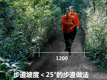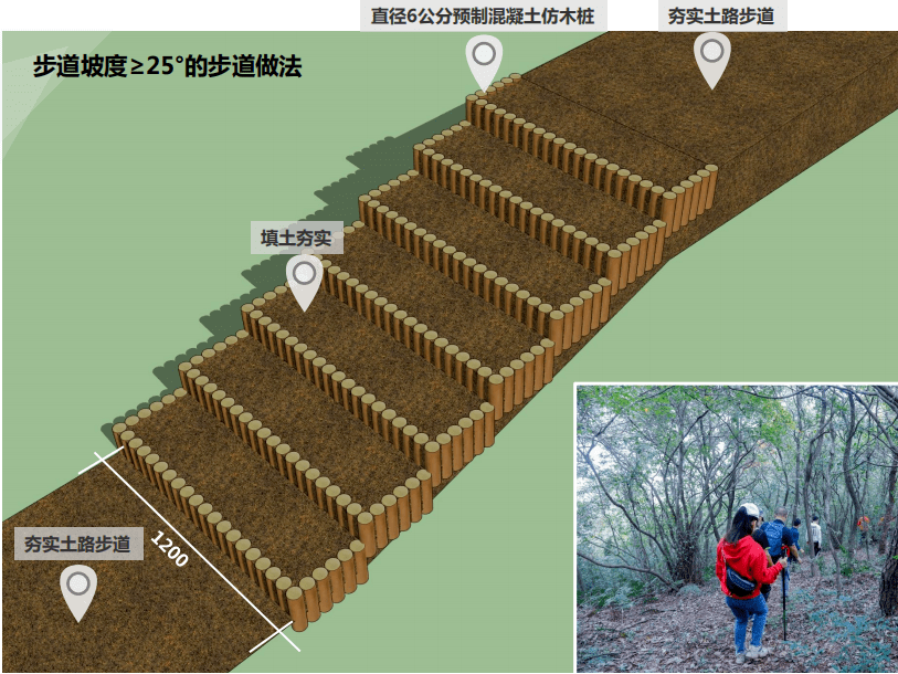 步道设计:步道坡度小于25度路段,保持现状土路,修整路宽至1.2m,且两侧各保持0.3m路肩。1.2m路面及0.3m路肩,人工夯实。步道坡度大于等于25度路段,建设仿木桩步道台阶。