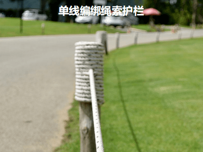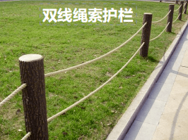 安全栏杆设计: 对于坡度较大或单侧存在大斜坡的步道路段设置防护栏杆。防护栏杆采用预制仿木方桩作为栏杆立柱,横向采用防腐粗麻绳作为防护横档。
