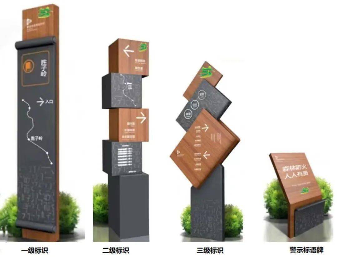 标识设计:以“行万里路,读万卷书”为灵感,结合线路特点、设施配套位置,设计三级标识系统,并于主要出入口布置警示标语牌。