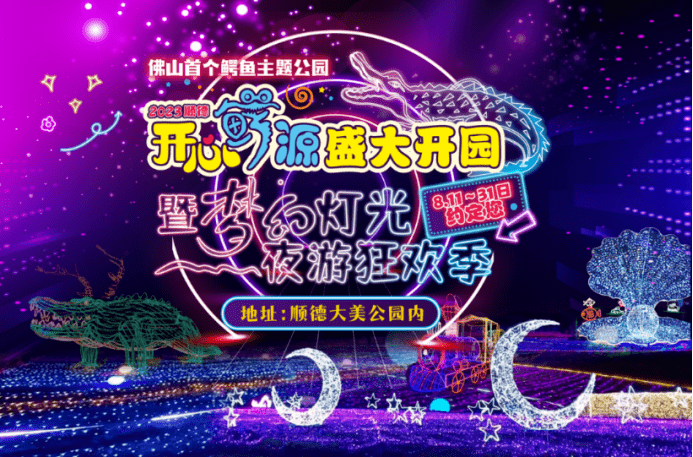 顺德北滘开心鳄源公园于2023年8月11日正式对外开园迎客!此项目是佛山唯一的以鳄鱼为主题生态园;为响应国家号召,推动夜经济发展,激活经济加快复苏,提倡暑期周边亲子游;特举办顺德梦幻夜游灯光狂欢季活动。丰富周边居民娱乐生活运动。