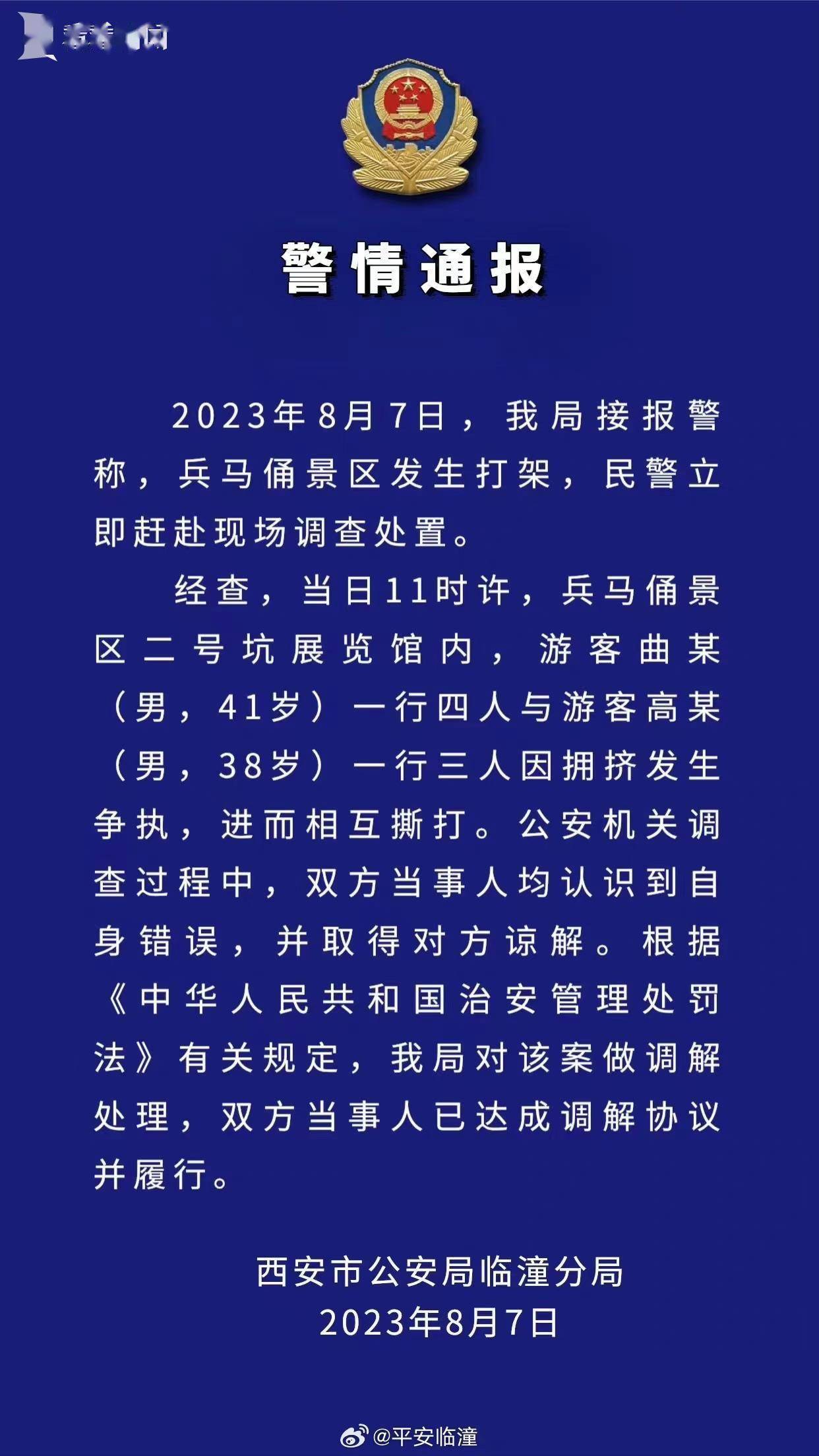 8月7日西安警情通报称,8月7日11时,游客曲某一行四人与游客高某一行三人兵马俑景区二号坑展览馆内因拥挤发生争执两人进而相互撕打。公安机关调查过程中双方当事人均认识到自身错误,警方对该案做调解处理,双方当事人已达成调解协议并履行并取得对方谅解