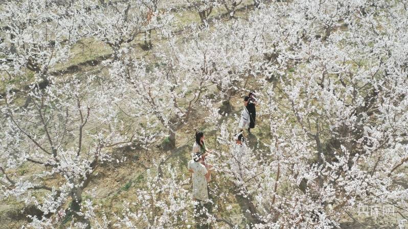 航拍杏花林中的游客(央广网发 和硕县委宣传部供图)