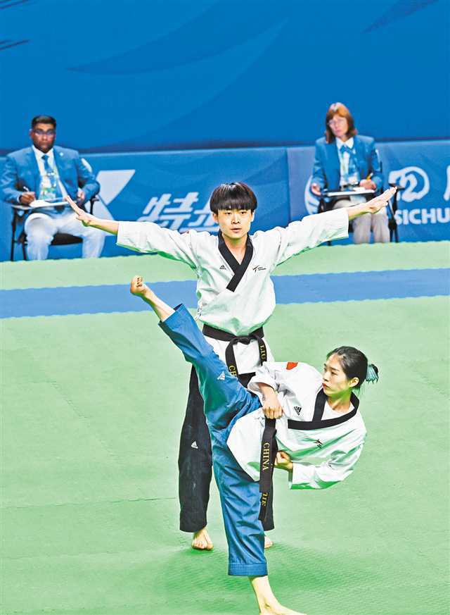 7月30日,成都大运会跆拳道混合双人品势决赛比赛现场,梁婕、刘思玥正在进行比赛。 |