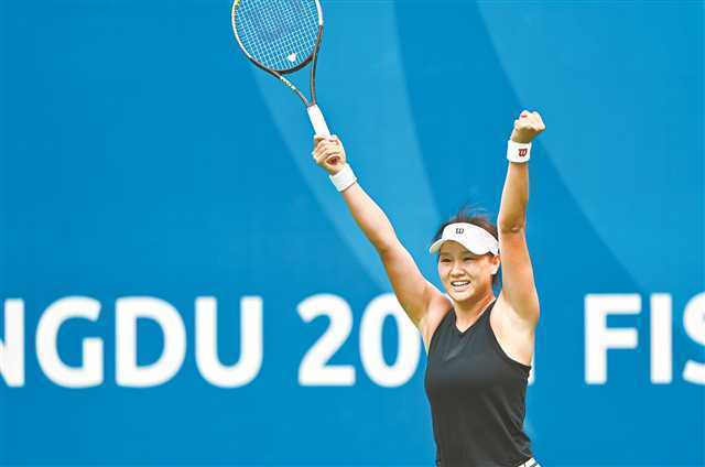 八月六日,成都大运会网球女子单打决赛,比赛结束郭涵煜庆祝胜利。 |