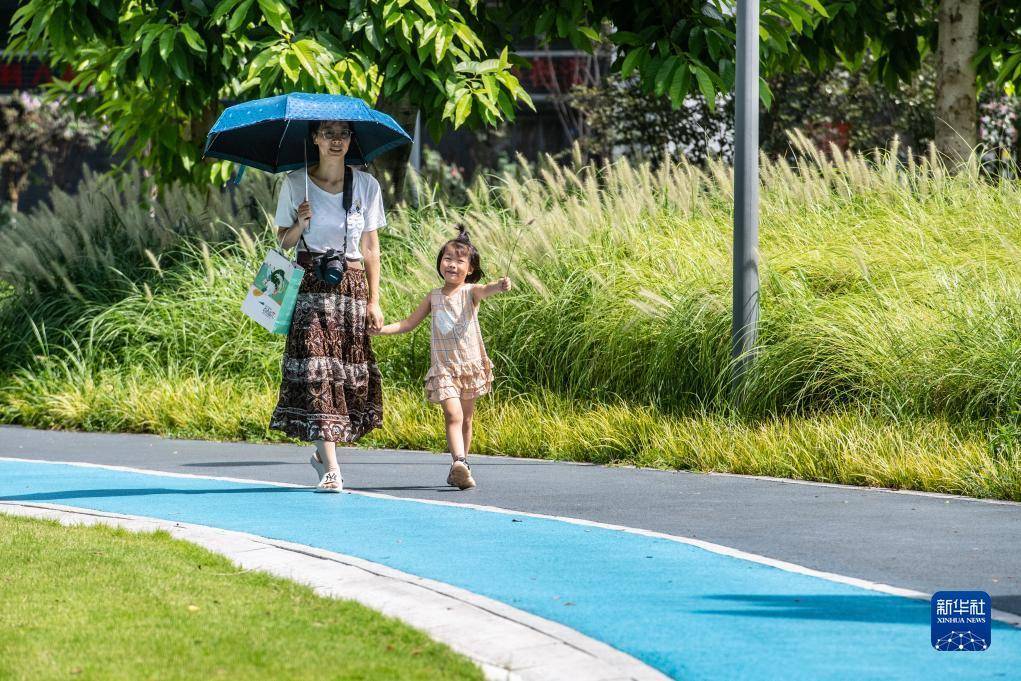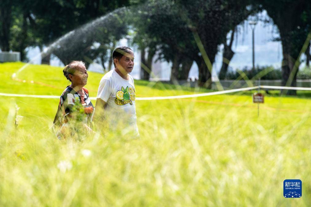 8月6日,在位于重庆长江岸边的珊瑚公园,市民在散步。新华社记者唐奕摄