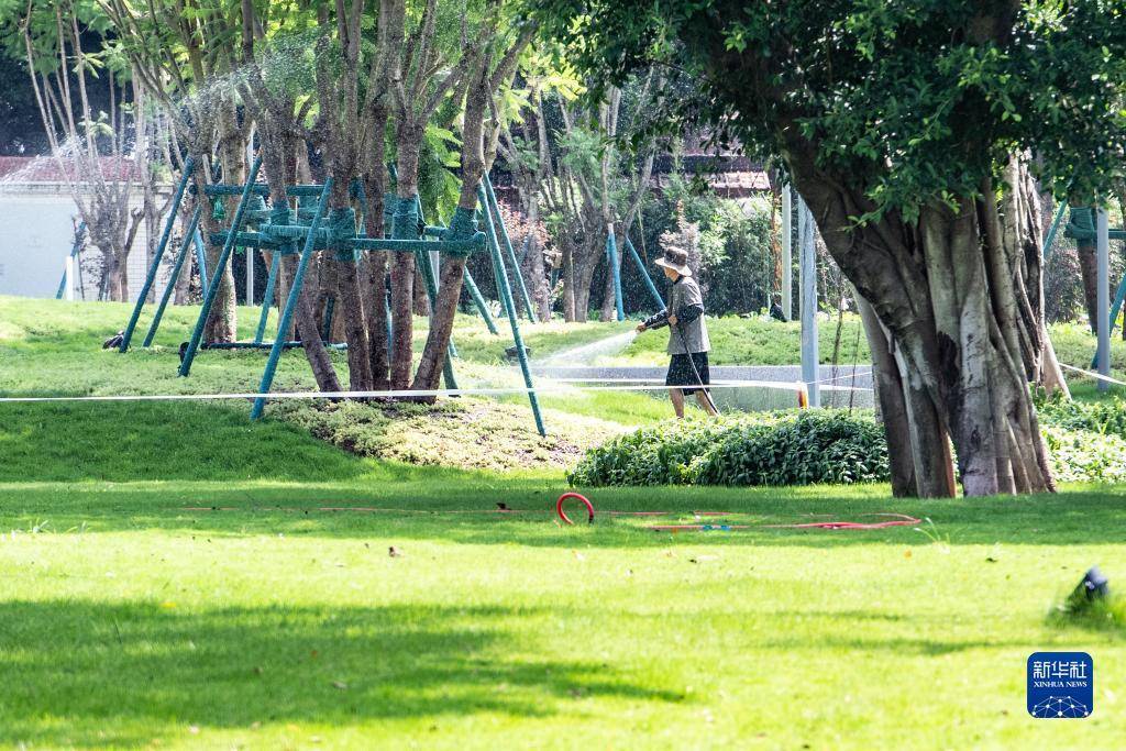 8月6日,在位于重庆长江岸边的珊瑚公园,工作人员在给草坪补水。新华社记者唐奕摄