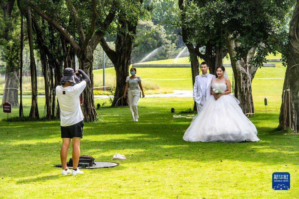 8月6日,在位于重庆长江岸边的珊瑚公园,新人在拍摄婚纱照。新华社记者唐奕摄