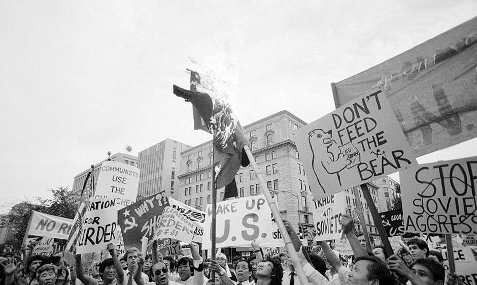 飞机被击落之前,全世界都静悄悄的,飞机刚一坠地,西方国家又立马闹腾了起来。老大哥美国急着替小弟出头,铺天盖地谴责苏联击落客机的行为简直不是人干的事儿。里根总统站在道德制高点上,在电视讲话中义正言辞地指责苏联提倡裁军等行为不过是“假和平”,背地里却搞恐怖主义。韩国人的表现更胜一筹,各大城市都爆发了反苏示威。男女老少扶老携幼跑到大街上哭,一边哭还一边骂苏联,那场面甭提多热闹了。