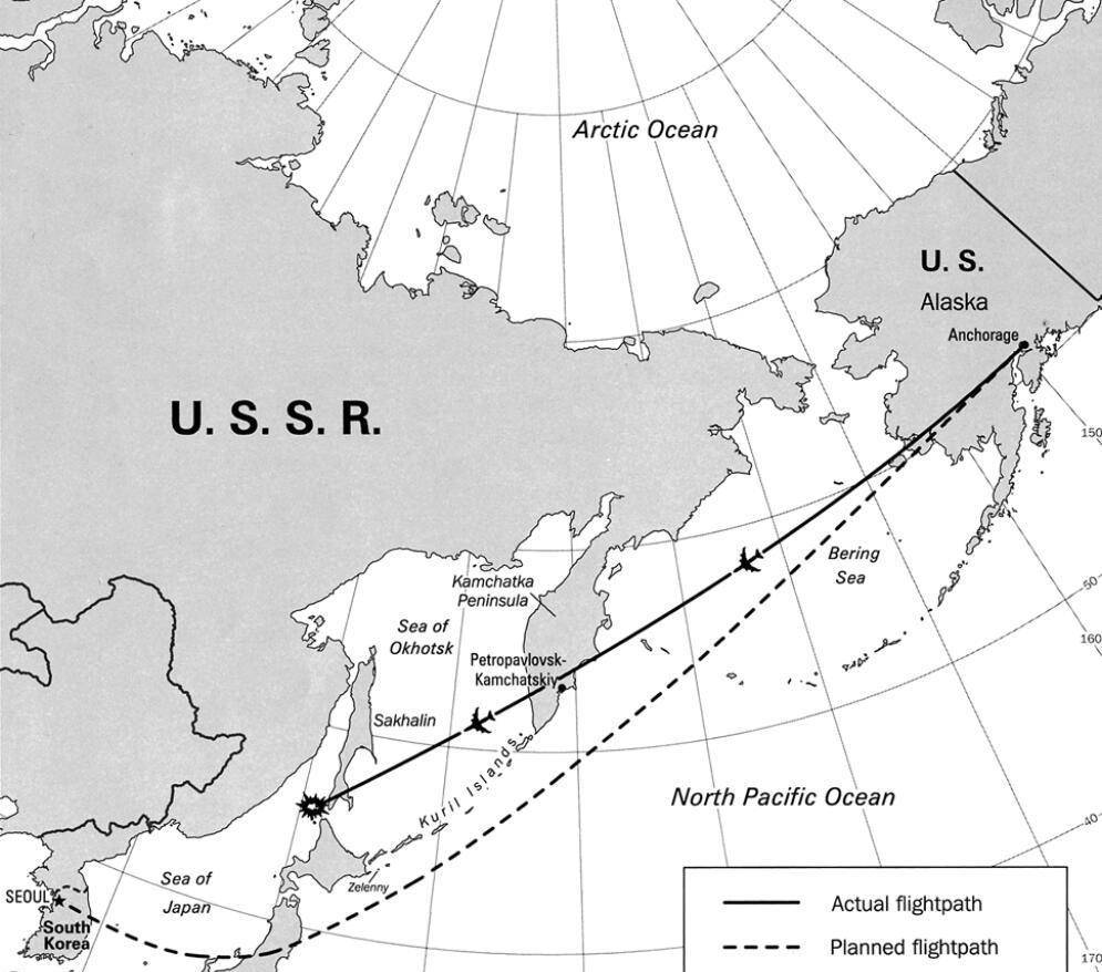 根据记录,这架飞机当时搭载240位乘客和29名机组人员,于1983年8月31日由美国纽约肯尼迪国际机场出发,先降落在阿拉斯加加了油,再绕个小弯横跨日本最终抵达韩国首都汉城的金浦国际机场。毫无疑问,这条航线完全绕开了苏联,结果谁也不知道飞机究竟发生了什么,居然旁若无人地直接飞到了库页岛一带。