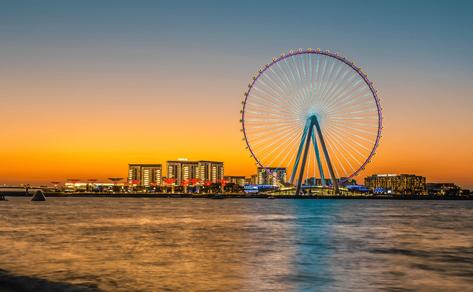 迪拜眼摩天轮是迪拜众多世界纪录景点中的最新地标。这座巨大的观景摩天轮位于蓝水岛,高达250米,是世界上最高和最大的摩天轮。