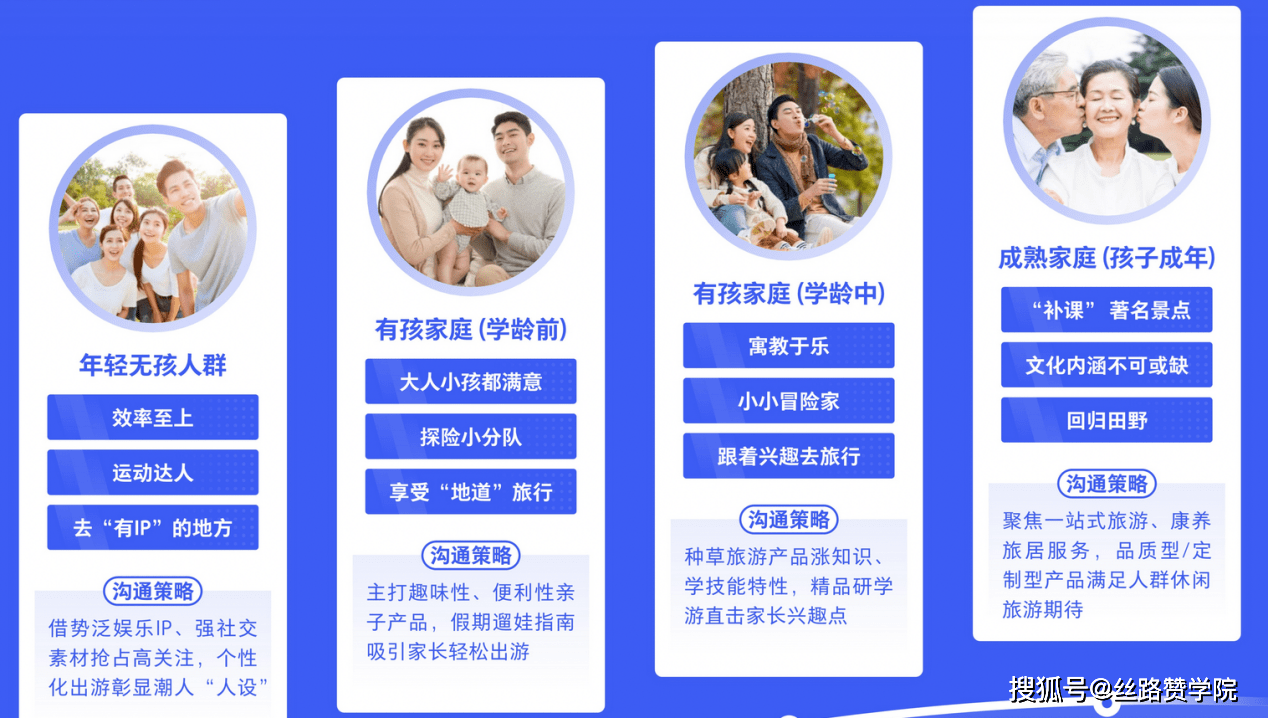 年轻无孩的人群,他们追求新鲜、时尚、独特的旅游体验。有孩家庭(学龄前)的人群,他们更关注儿童教育和亲子互动。有孩家庭(学龄中)的人群,他们更关注子女教育和成长;成熟家庭的人群,他们更注重休闲、健康和文化体验。因此,文旅企业应该根据不同的人群需求,从产品、服务、体验等方面进行调整和创新,以满足消费者的需求,获得更好的市场竞争力。