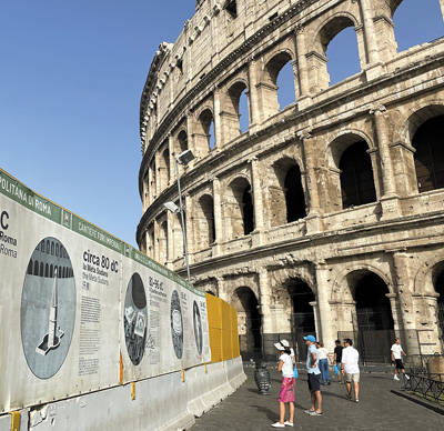 在意大利罗马热门景点斗兽场,游客正在阅读带有中文解说的标识牌。