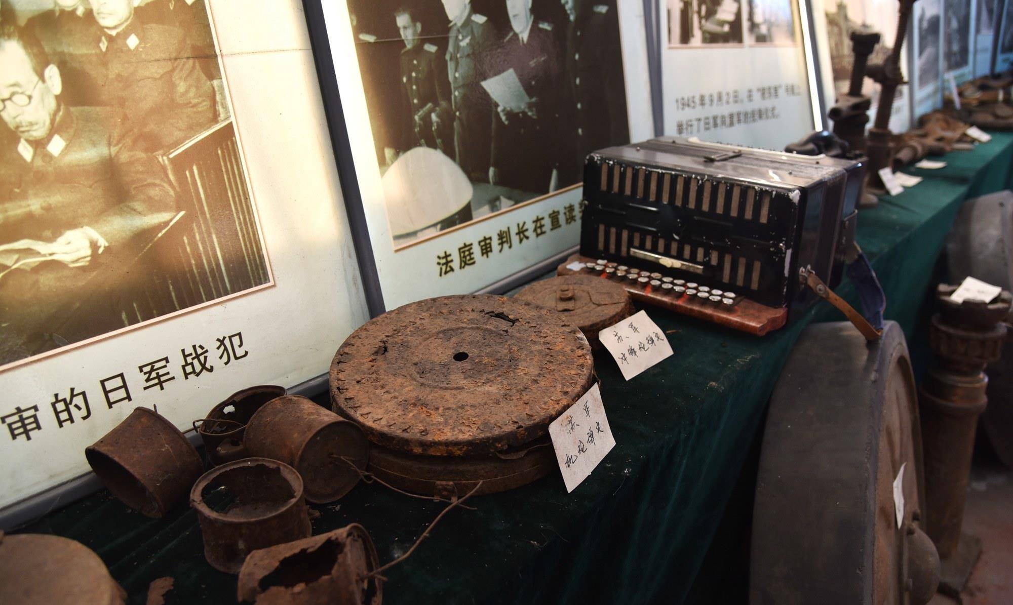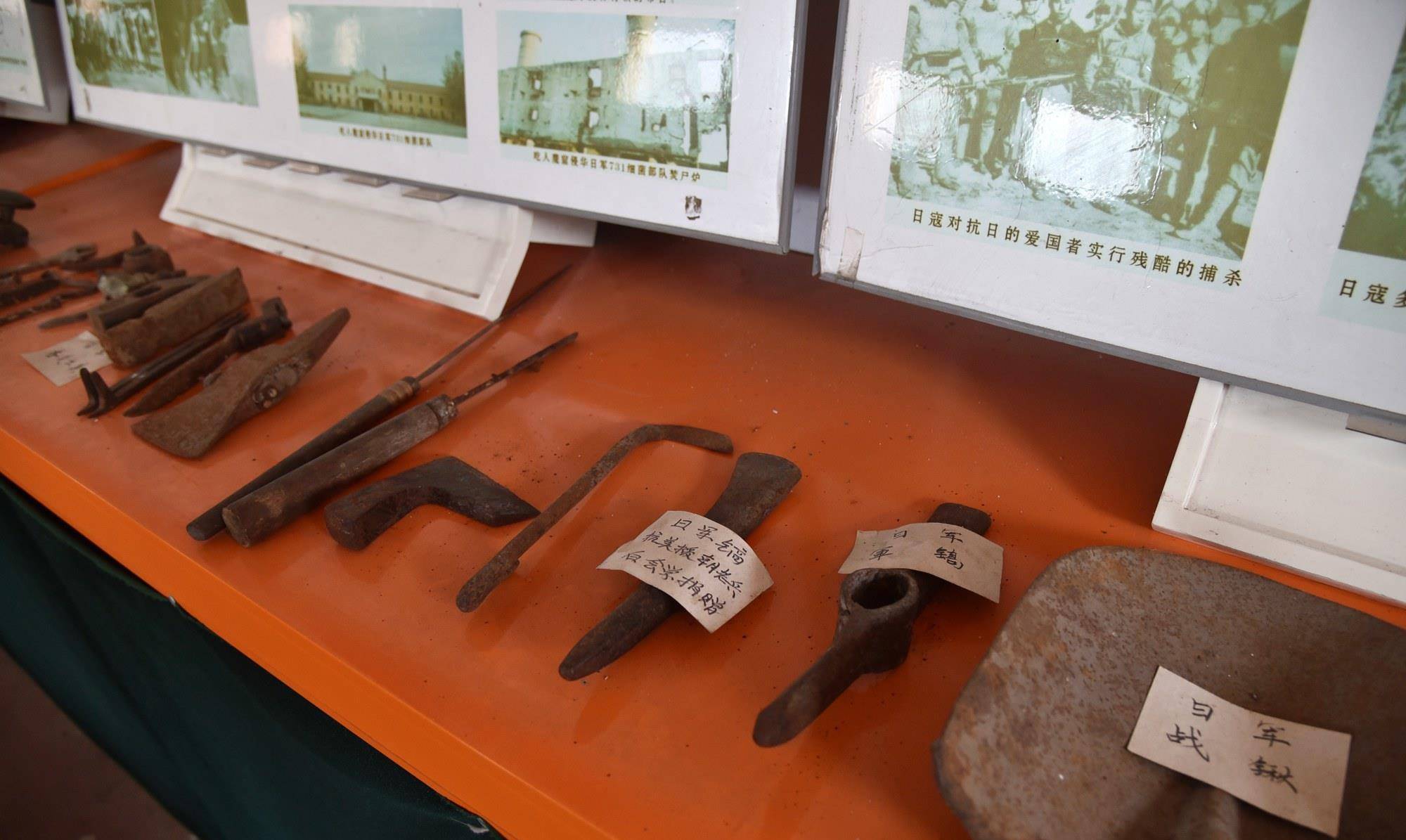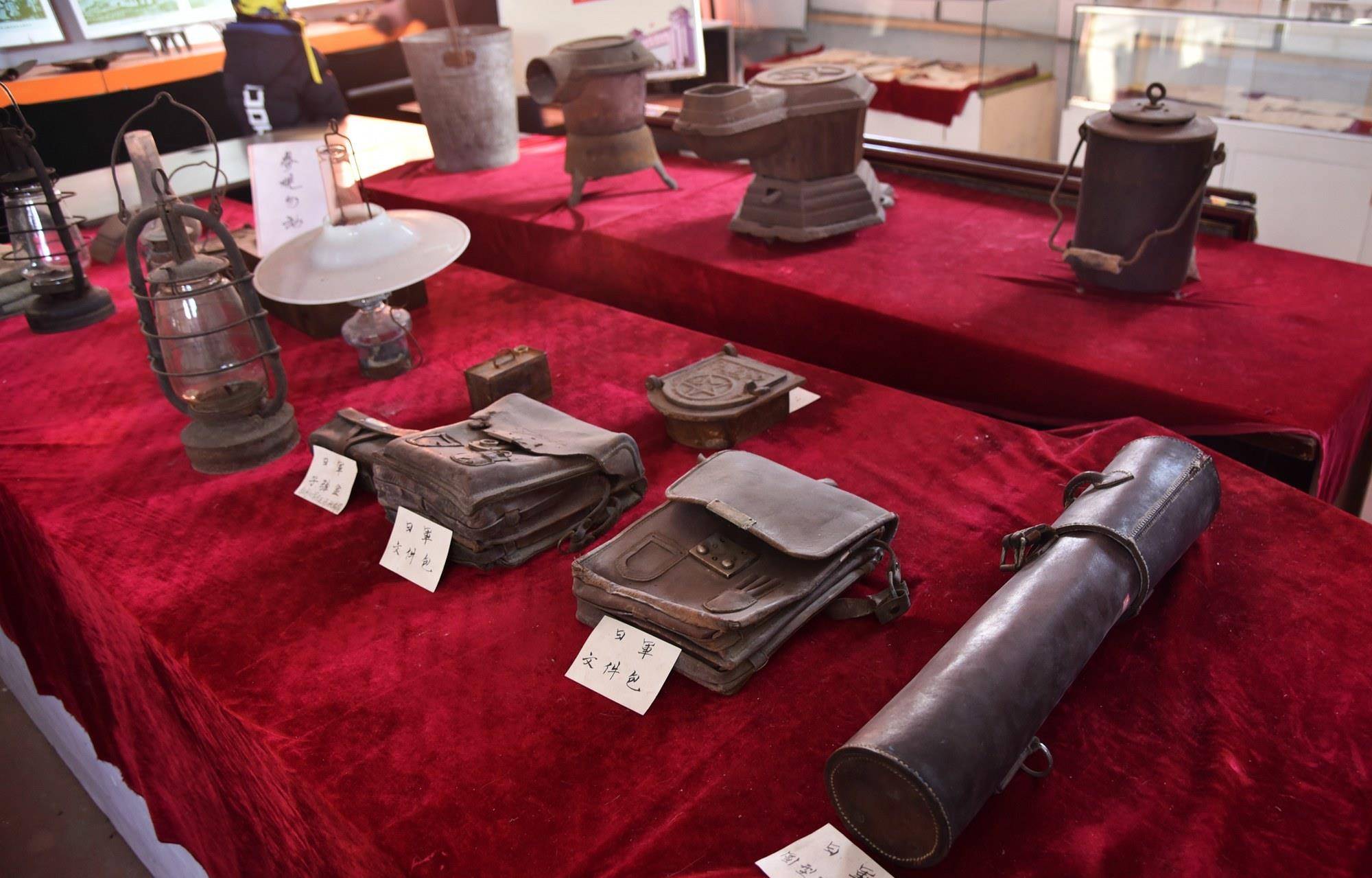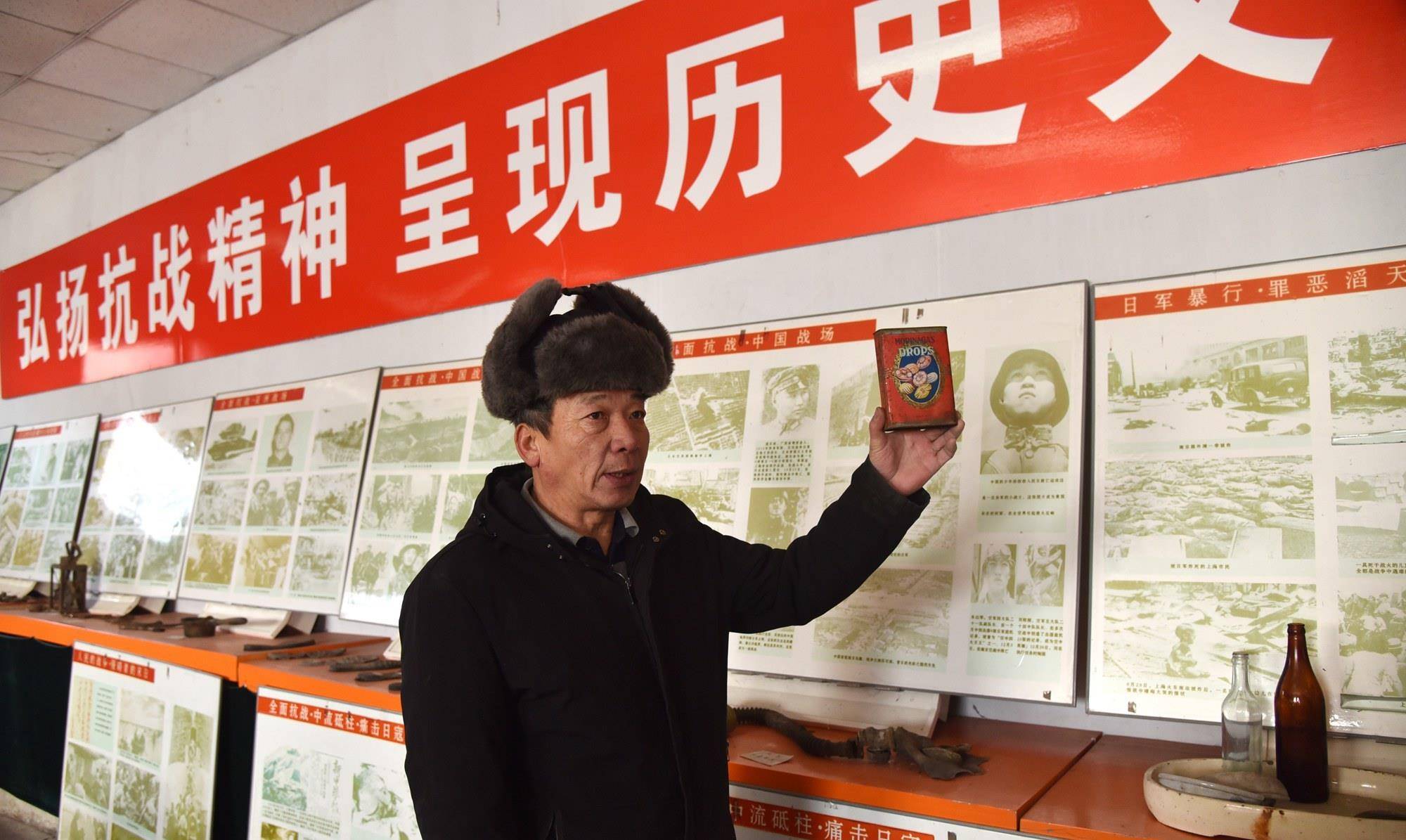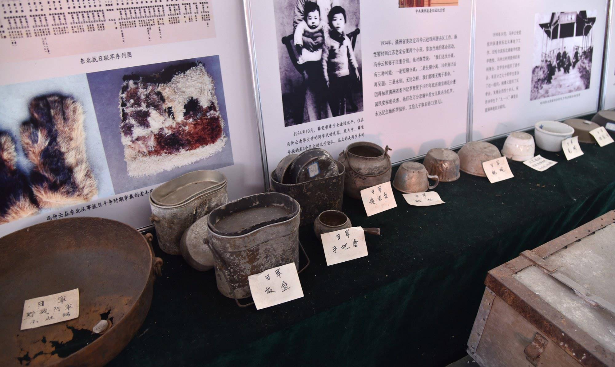 纪念馆收藏了三千多件抗日战争时期的遗物,我们看到这里既有武器、防护用品也有生活用具,可以看出当年日军对我国东北长期占领的野心。这些展品都是一件件罪证,曹馆长向我们一个个介绍,如数家珍,很多藏品都有不平凡的来历和背后的故事。侵华日军遗留下的糖盒是日本前首相安倍夫人的家族企业生产的。曹馆长拿起一顶被子弹洞穿的头盔告诉我们:一颗子弹穿过,头盔下面一个年轻鲜活的生命戛然而止,战争就是这么残酷。