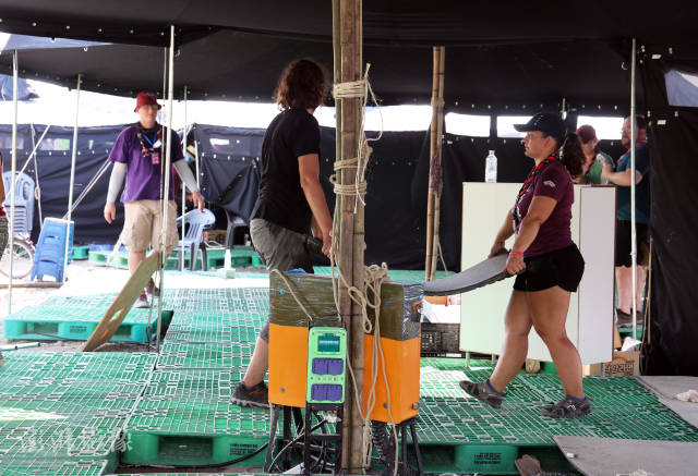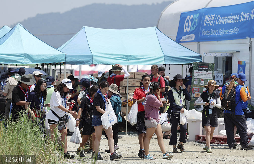 韩国举行的“世界童子军大会”自2日晚开幕后已有超百名参加者中暑,抱怨声接连不断,韩国《朝鲜日报》此前评论称,如果韩国政府不全面出手,韩国会在国际上蒙羞,还有参加者社交媒体上的吐槽,这是“真正的生存游戏”。在这种背景下,据韩联社5日报道,英国和美国的代表队因条件恶劣提前退出活动,这可能会导致各国代表团“多米诺骨牌式离队”。图为8月2日,韩国扶安郡,世界童军大会参加者离开露营地的便利商店。