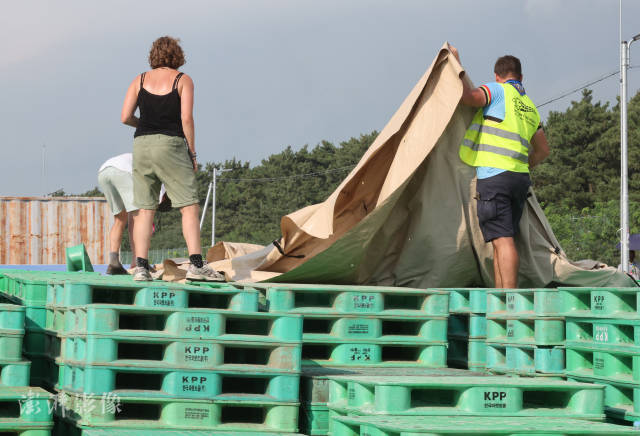 据韩媒此前报道,“世界童子军大会”被称为“年轻人的文化奥运”,第25届“世界童子军大会”开幕式活动于2日晚举行,来自158个国家和地区的约4.3万名青年童子军聚集在韩国西南部海岸新万金填海区的一个大型营地。图为8月5日,韩国全罗北道,美国代表队因条件恶劣提前退出“世界童子军大会”,其营地堆放参赛者的行李。