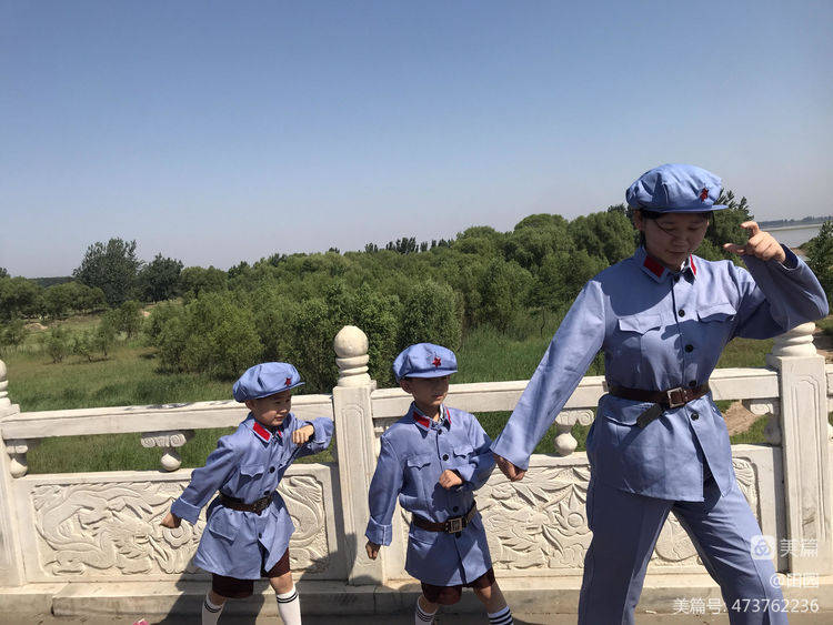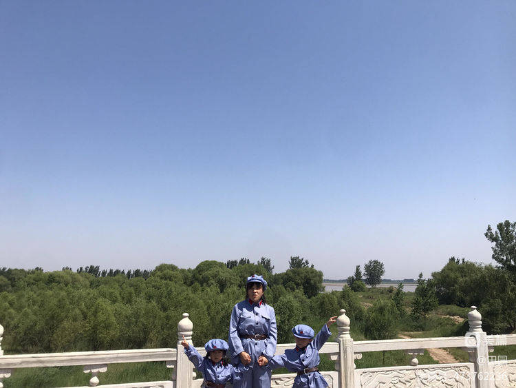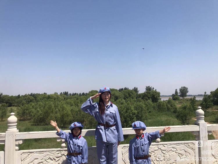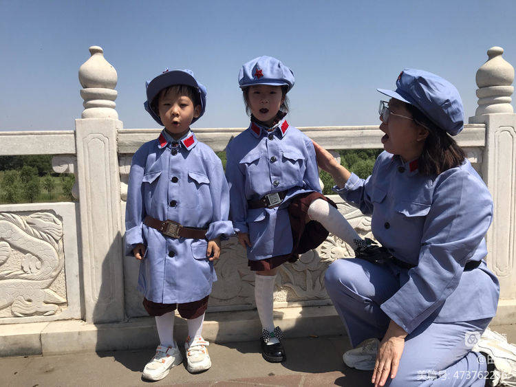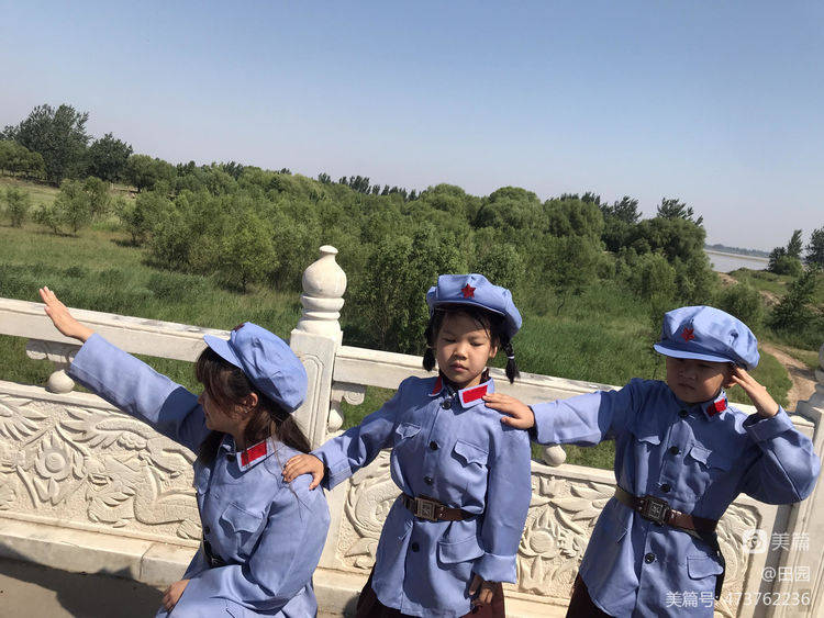 只有老师讲述不过瘾,身着军服来体验爱祖国妈妈,醒目提醒家人都要爱母亲河---黄河!一边拍照一边说出自己的心里话"保护黄河,热爱和平"!(不过小编在这里温馨一下:由于气温较高,不是毎个小朋友都换小红军服装,举手第一名的换小红军服装,所有孩子在后续环节里进行红色教育宣誓等活动)