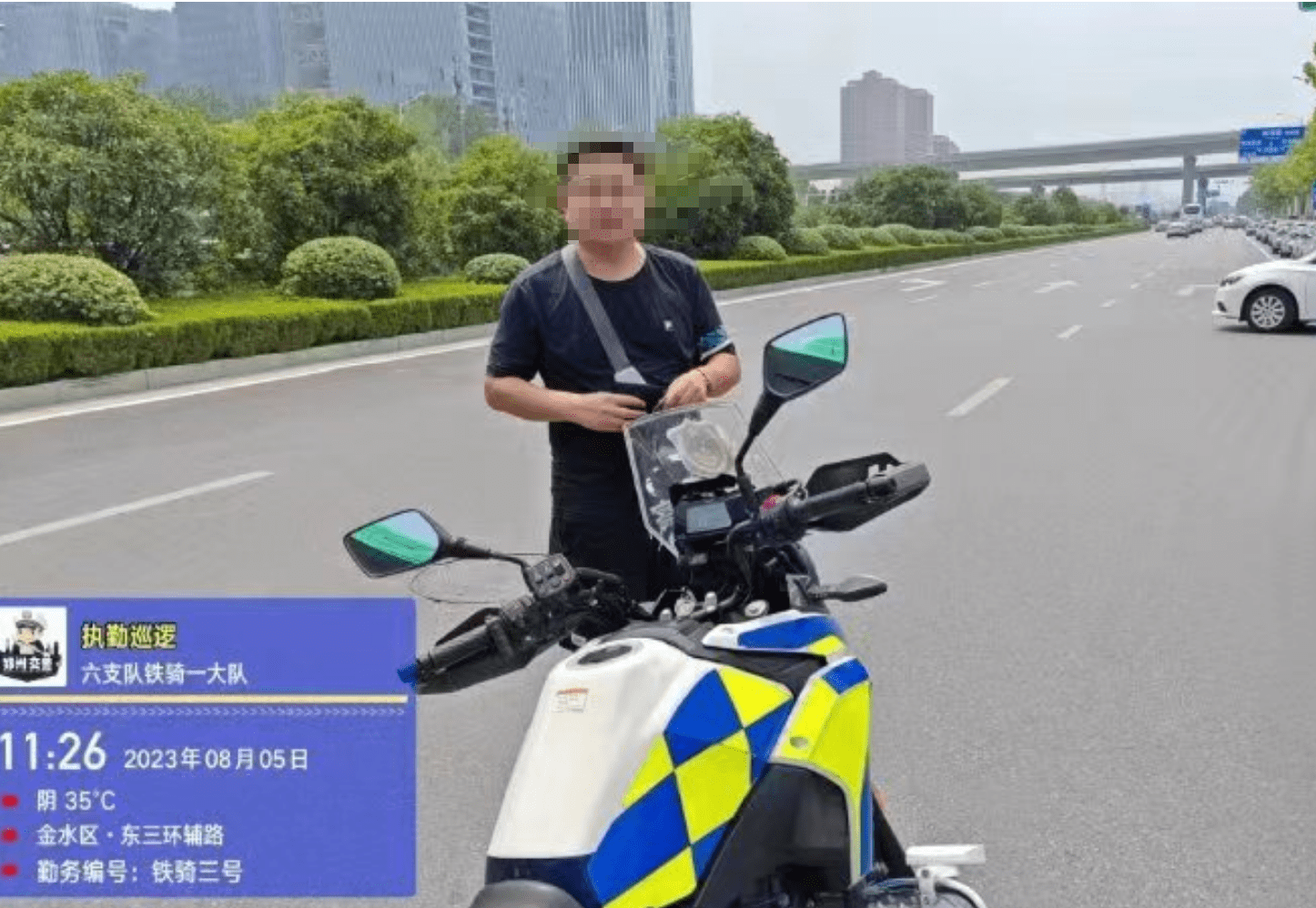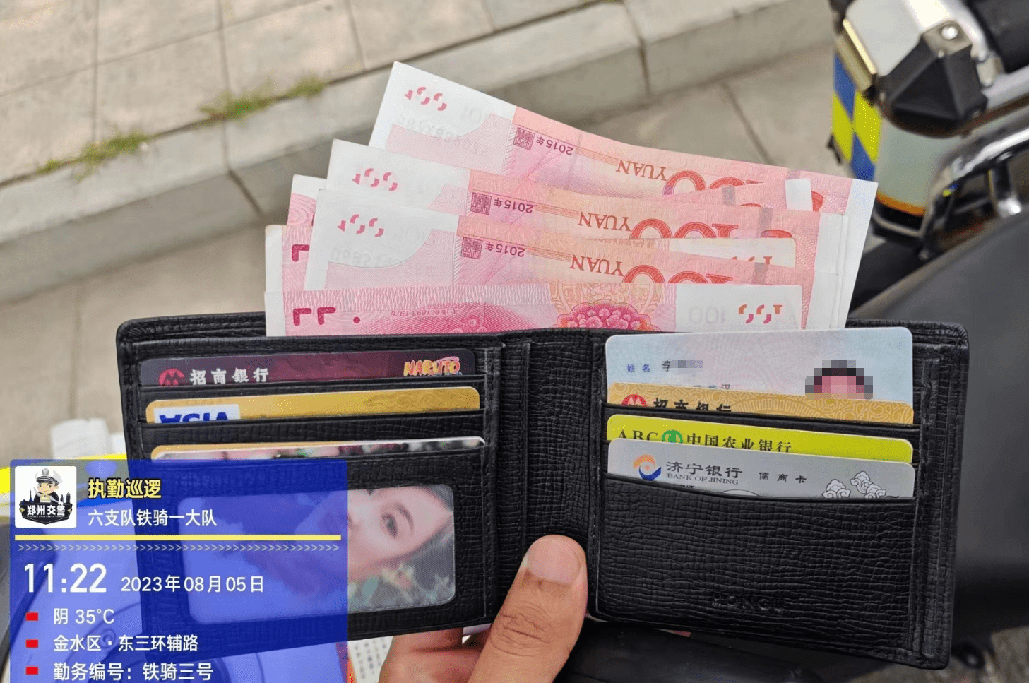 8月5日上午11时20分许,郑州交警六支队铁骑队员马航行正在高铁东站周边巡逻执勤时,发现地上躺着一个黑色的皮夹,他捡起后发现里面装有现金、银行卡、身份证件等物品。