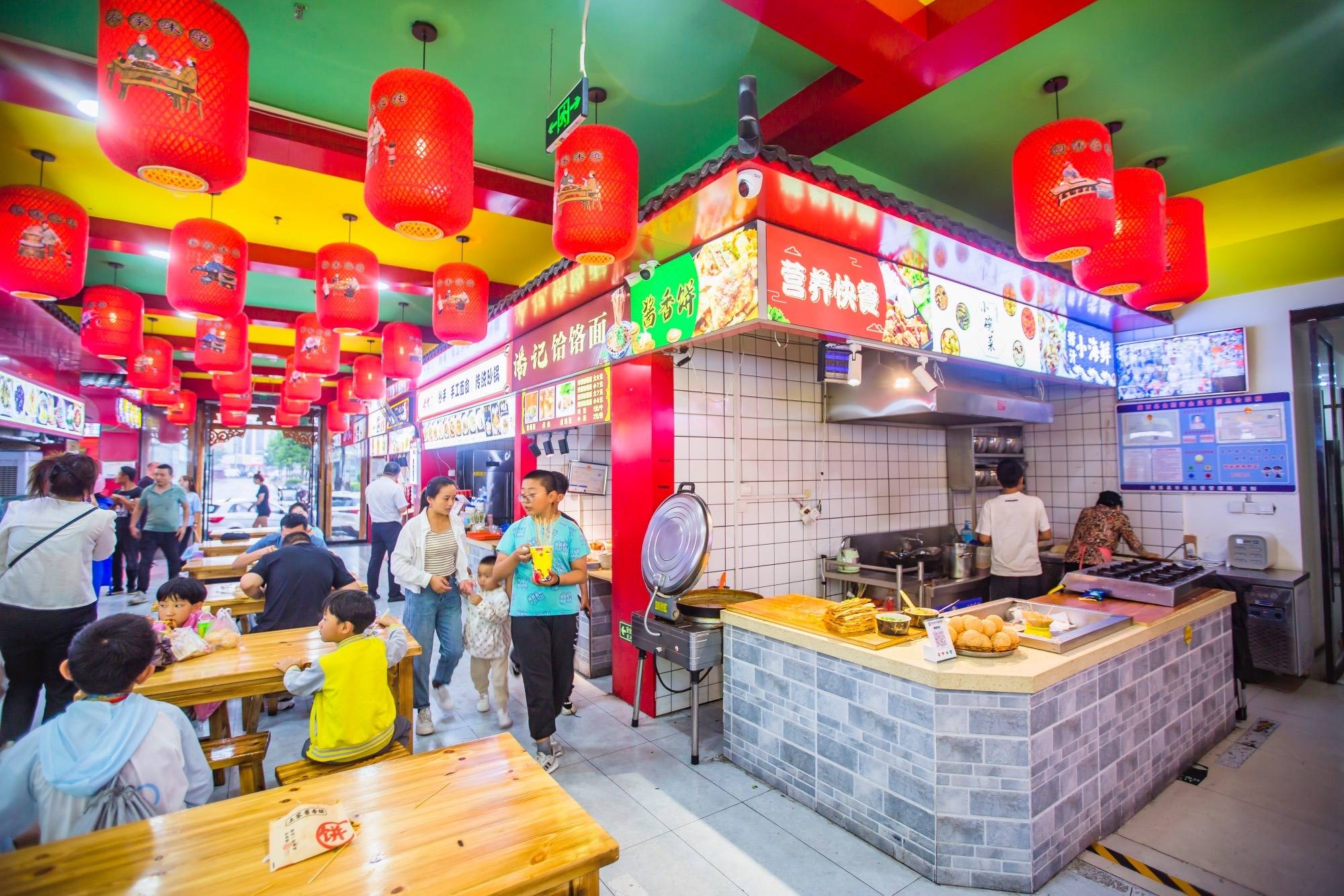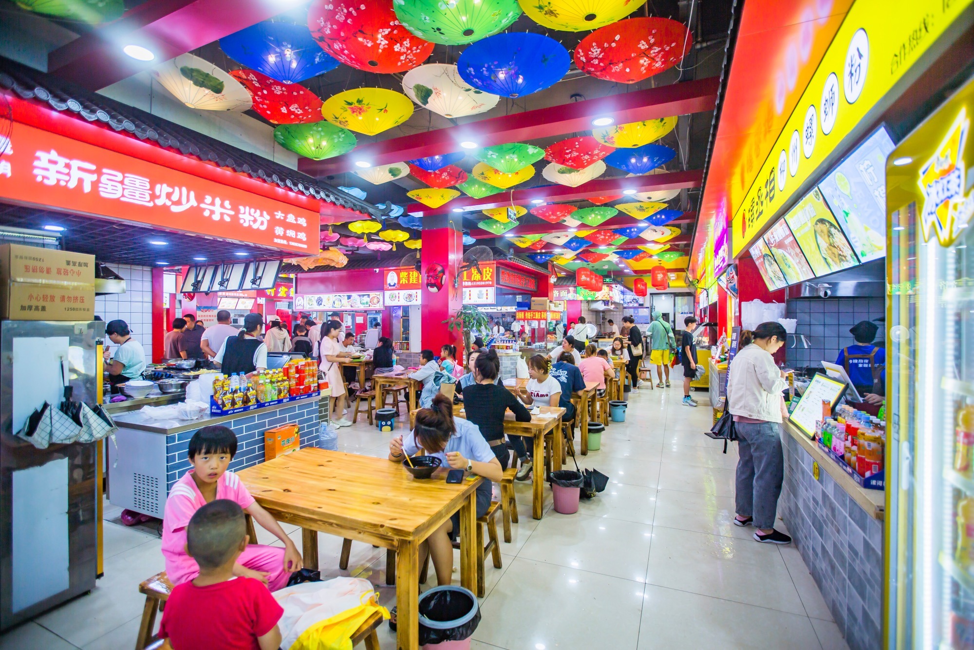 不妨先在小吃城里转上一圈,为这场活色鲜香的“美食之旅”热热身。小吃城面积极大,环境主打一个仿古怀旧,木桌木椅青石砖,红灯笼和油纸伞高挂,大小摊位前都有醒目亮眼的招牌,这种嘈杂的环境特别容易让人产生放松感。