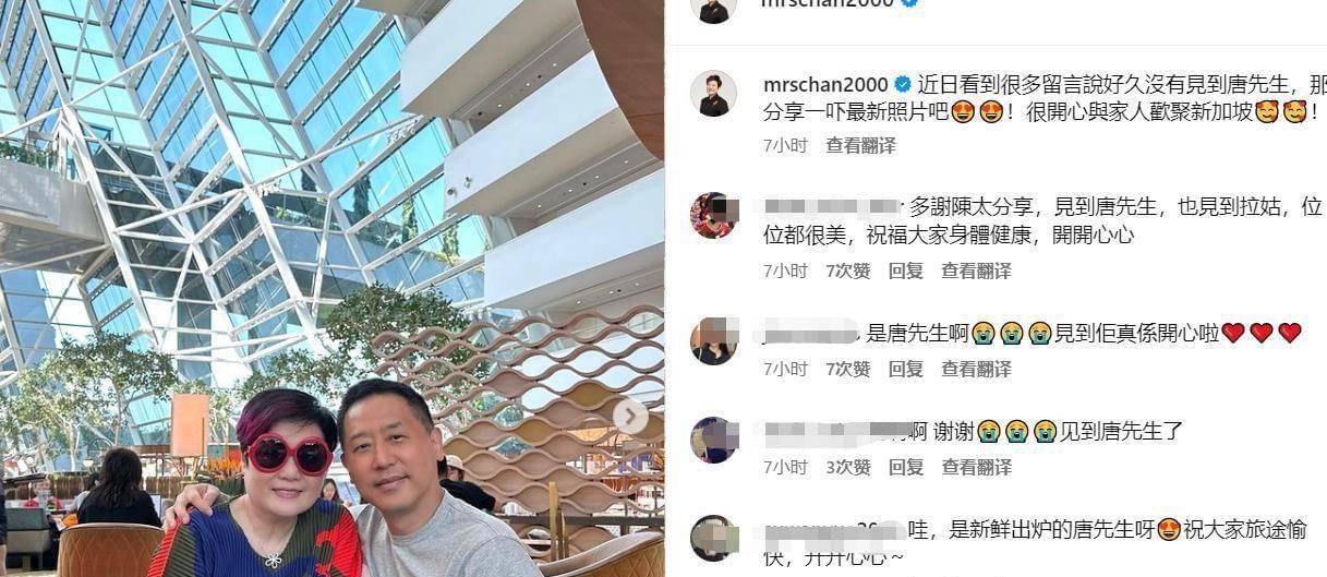 陈淑芬,张国荣的经纪人,在8月6日通过个人社交账号分享了一组照片。她在配文中表示最近看到很多留言说很久没见到唐先生,因此特地分享了一些最新的照片。她非常开心能与家人欢聚在新加坡。
