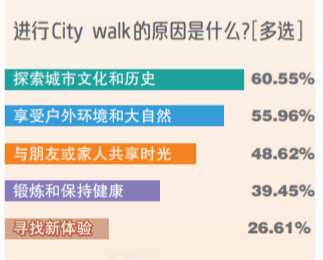 顶着40℃的高温也要漫步,年轻人到底图啥?调查问卷结果显示,60.55%受访者认为City work的主要原因是探索城市文化和历史,55.96%受访者认为是为了享受户外环境和大自然,48.62%受访者认为可以与朋友和家人共享时光。