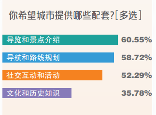 如果你到一座城市享受慢节奏旅游,你希望这里有哪些配套措施?调查问卷结果显示,60.55%受访者希望当地提供导览和景点介绍,58.72%受访者希望能提供导航和路线规划,52.29%受访者希望能设计一些社交互动活动。