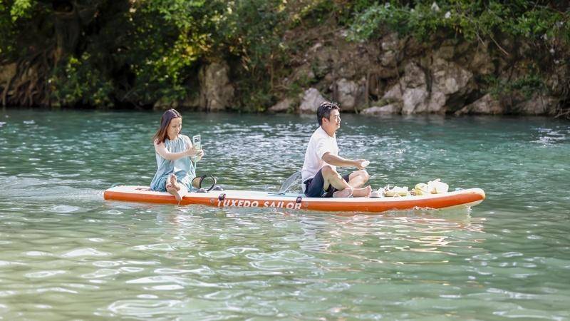 8月4日,游客在贵州省黔南布依族苗族自治州罗甸县沫阳镇大小井景区玩浆板。