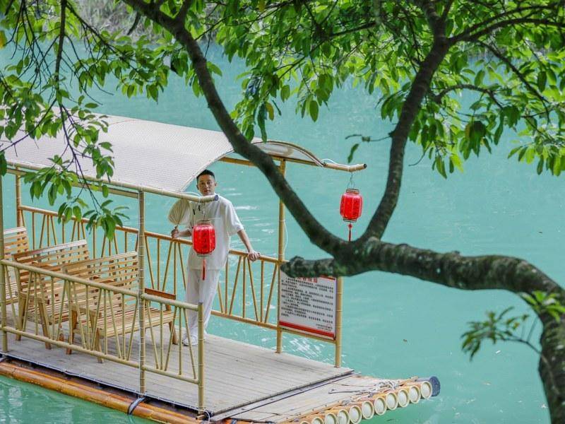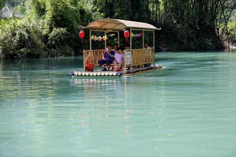 8月4日,游客在贵州省黔南布依族苗族自治州罗甸县沫阳镇大小井景区乘坐竹筏游玩。