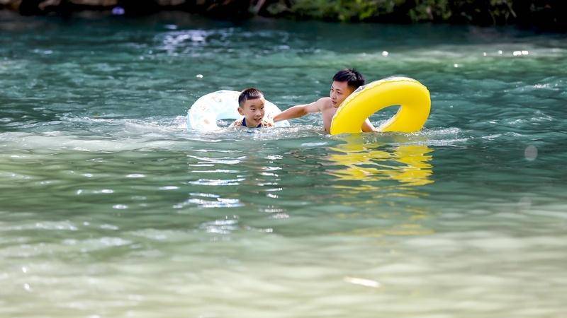 8月4日,游客在贵州省黔南布依族苗族自治州罗甸县沫阳镇大小井景区游泳玩水。