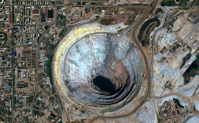 米尔内钻石矿场位于俄罗斯,是世界上已知的最大露天钻石矿坑之一。矿场的入口直径有1300米,深度达到了500米。从高空往下看的话,好像是一个超级大的漩涡。正是因为这个洞太大,太深,导致上空会形成一个气流漩涡,一些小型的飞机如果经过这里就会被洞给吸进去。