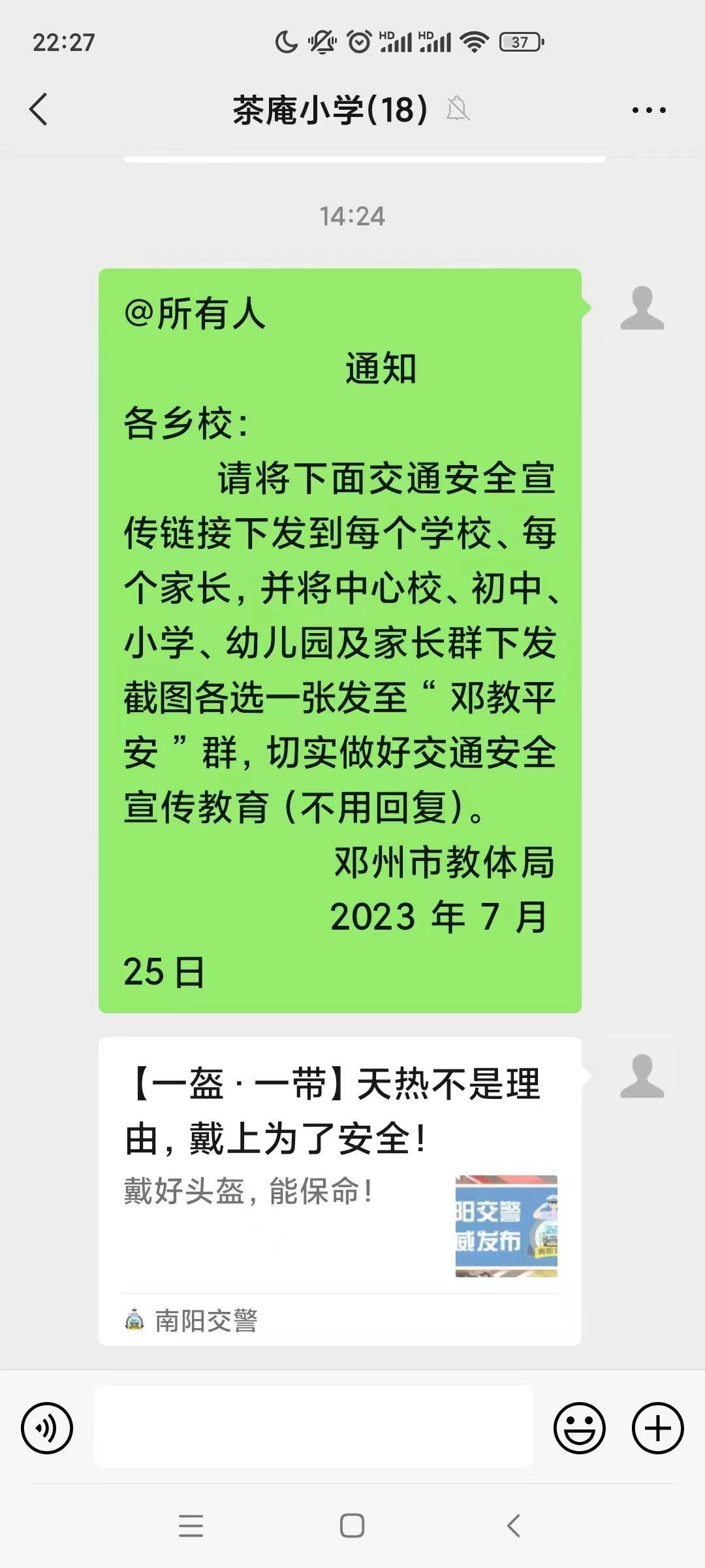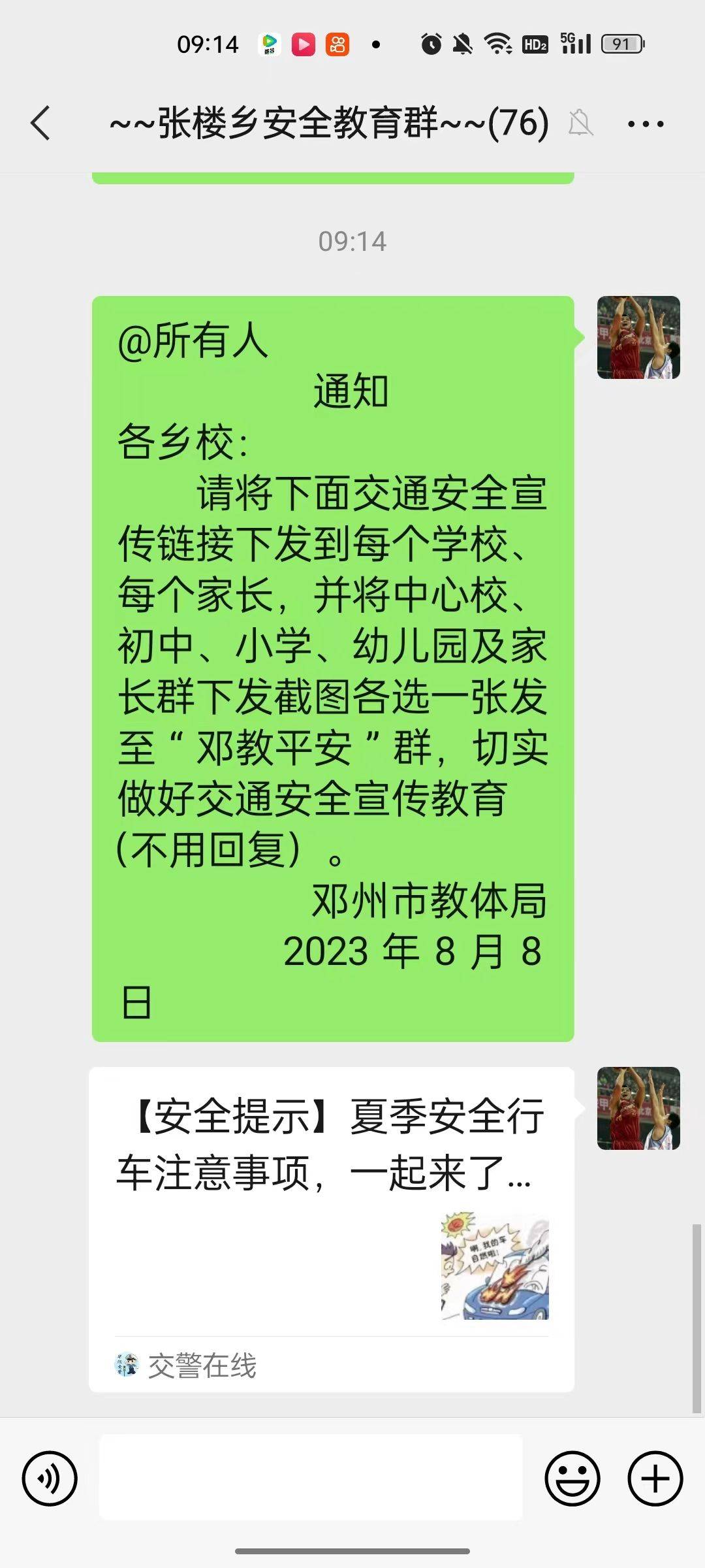 暑假期间,孩子们的出行安全牵挂着学校老师、学生家长的心。该镇中心校要求,全乡中小学及幼儿园班主任坚持每周一次给全体家长推送交通安全提醒微信、短信,内容涉及交通安全小常识、规则避险小妙招、交通警示案例回顾、交通小视频等,形式翻新,教育深刻,实实在在为师生及家长补充了“交通安全警示精神粮食”,保障生命安全,共同营造暑期安全文明的交通环境。