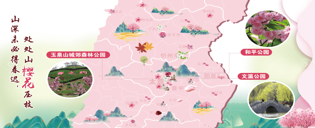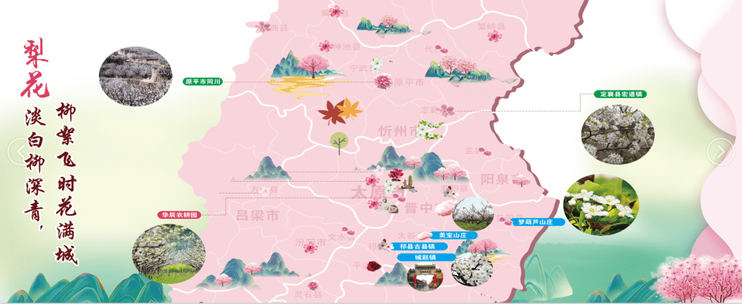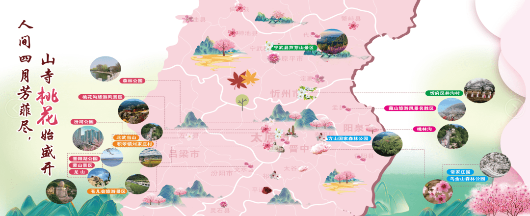 忻州:忻府区陀罗山景区、原平市云水镇于家沟、偏关县杏花、定襄县龙山庄园、蒋村镇宽沟众怡久旅游农场、繁峙县赵庄村杏花