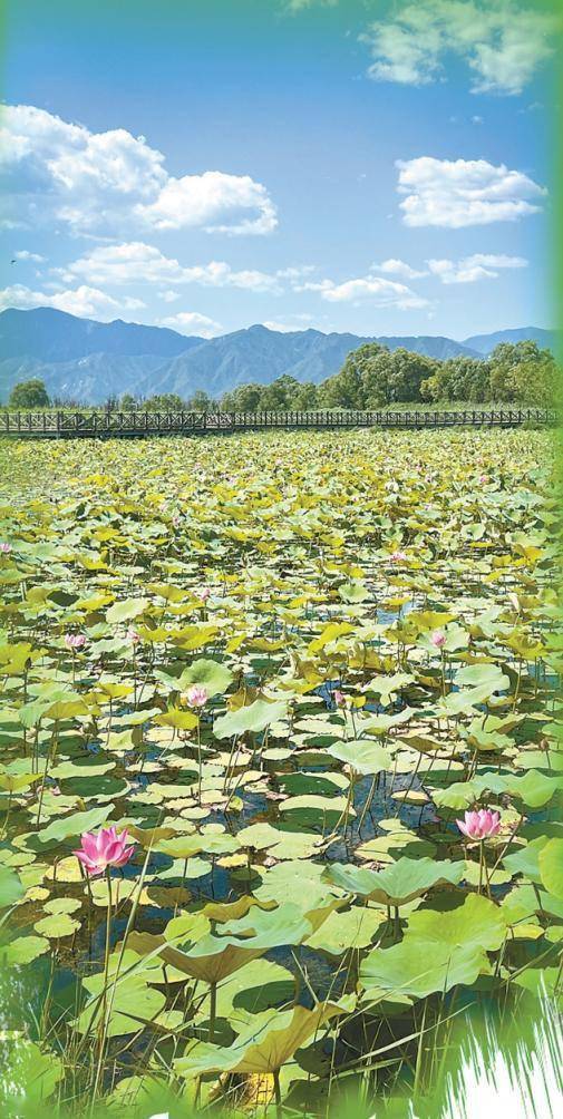 野鸭湖也是一幅夏日胜景。巍巍海陀山下,荷叶田田蔓延至远方,花瓣粉嫩、莲蓬翠绿,赤麻鸭、白骨顶鸡、苍鹭等鸟儿在湖心岛上觅食、栖息。秋天,还有大批灰鹤、豆雁等候鸟飞来与它们做伴,鸟儿们沿途经过张家口市闪电河、野鸭湖等“候鸟机场”打尖儿、休憩,补充体力。令人欣喜的是,近两年来,丹顶鹤、大鸨等国家一级、二级重点保护野生动物纷纷飞临两地,令湿地工作人员们欣喜不已。