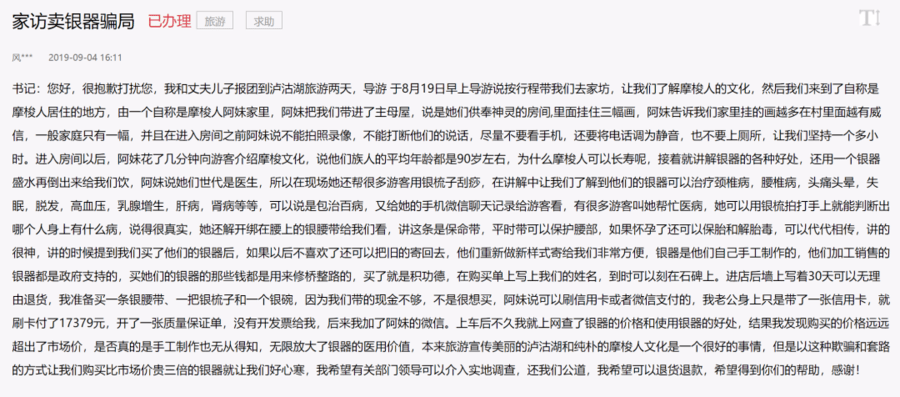 在人民网领导留言板上,有关出门旅游买银器被套路的举报屡见不鲜。之前就有游客举报称自己到泸沽湖旅游,却遭遇了“银器”骗局。