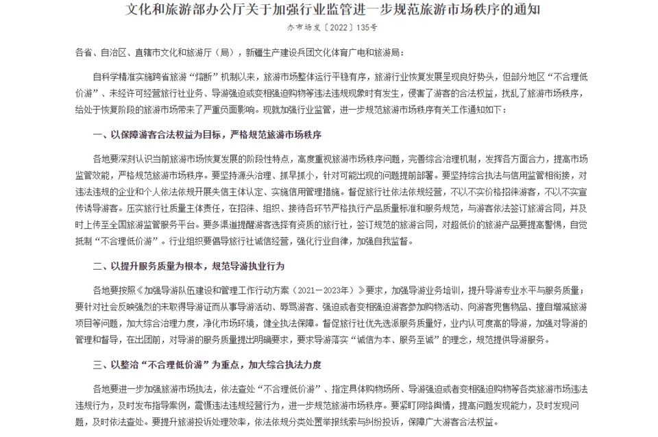 去年8月,文化和旅游部发布《关于加强行业监管进一步规范旅游市场秩序的通知》,其中明确提及:对部分地区不合理低价游、未经许可经营旅行社业务、导游强迫或变相强迫购物等违法违规现象加强行业监管,进一步规范旅游市场秩序。